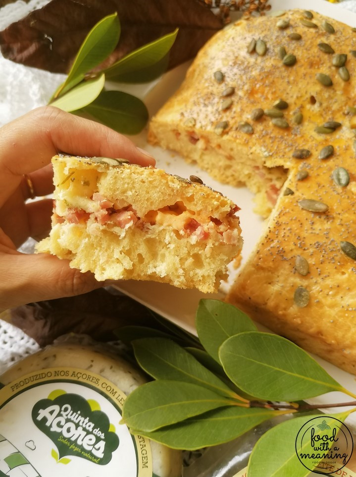 As bôlas são os lanchinhos ideais. Esta, composta por três queijos da Quinta dos Açores (alho e ervas; pimenta da terra; amanteigado), presunto, bacon e chourição, aliou-se a uma massa fofa e deliciosa, porque rica em ovos e azeite, e fez as honras do lanche desta tarde.