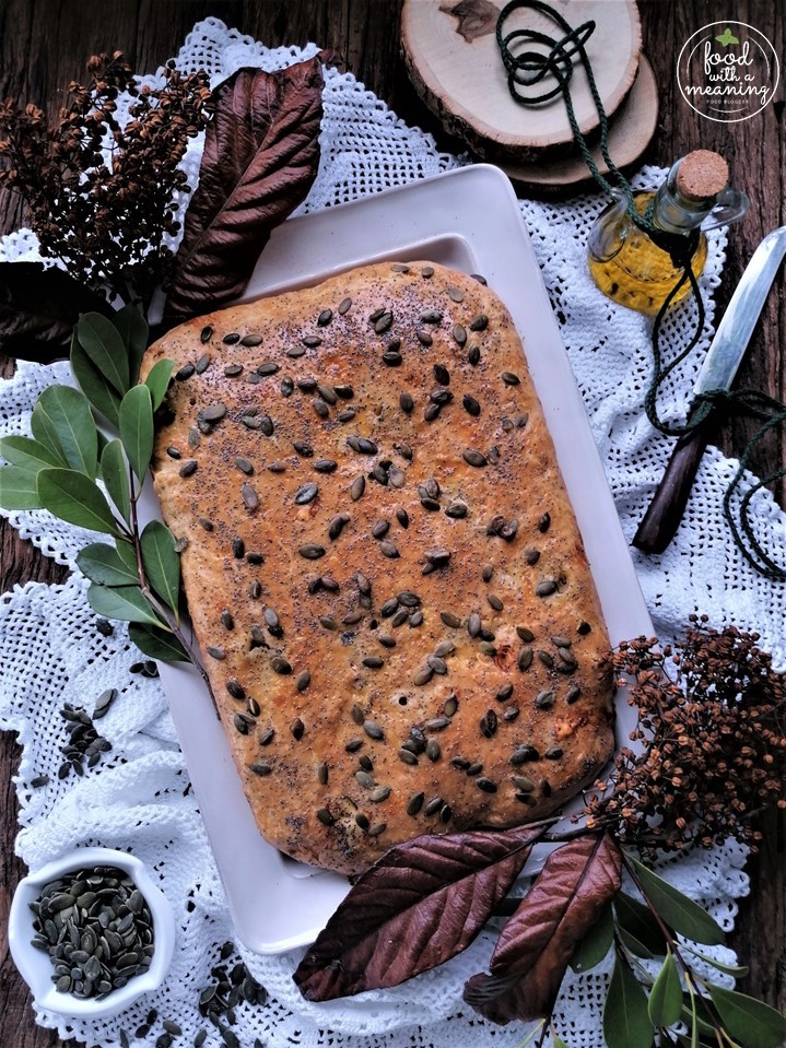Pincele o folar com a gema desfeita num pouquinho de clara, e polvilhe com sementes de papoila e de abóbora.