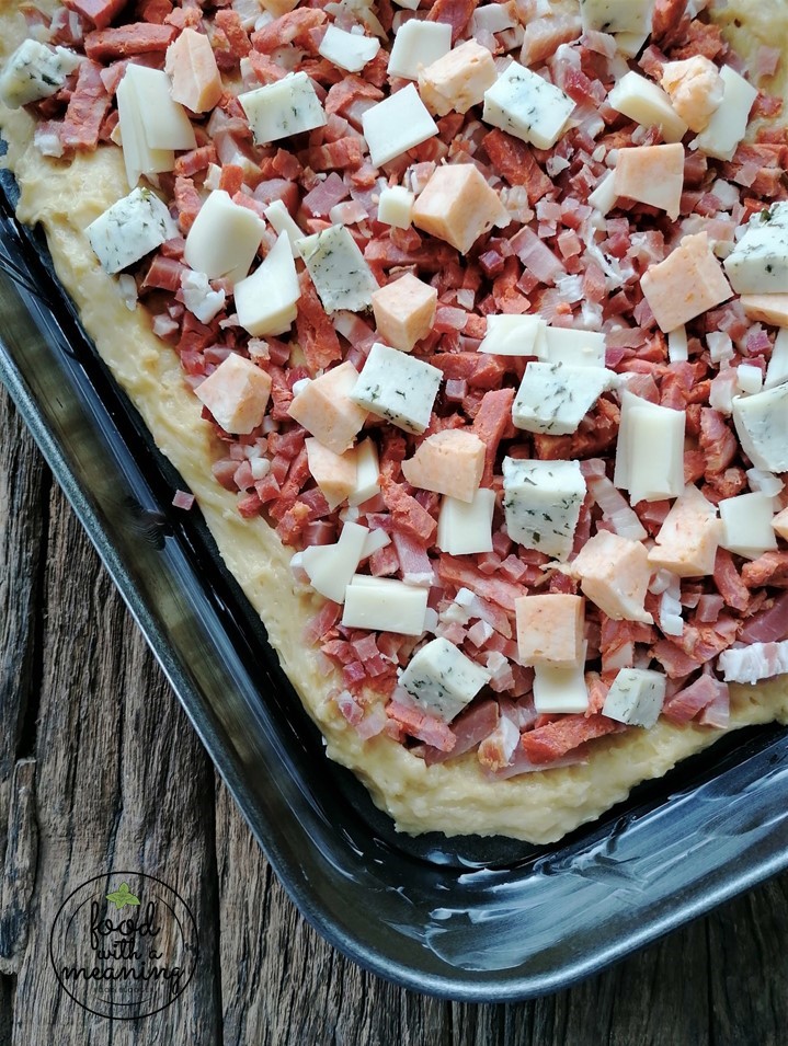 Pegue na restante massa e estique com as mãos para cima dos enchidos e dos queijos e una-a com a camada de massa de baixo.