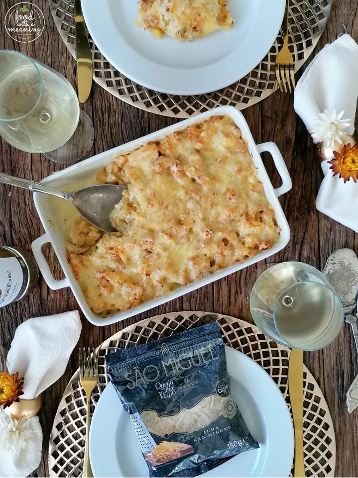 O bacalhau com natas é uma receita clássica da culinária portuguesa e é uma das mil e uma formas de servir bacalhau. Cremoso, devido à adição de natas e de molho béchamel, é uma receita obrigatória no repertório dos jantares de família. O queijo ralado São Miguel, curado de pasta semidura, com textura firme e apresentando uma cura mínima de 9 meses. tem um sabor sem igual. Aqui, gratinado, elevou o prato.
