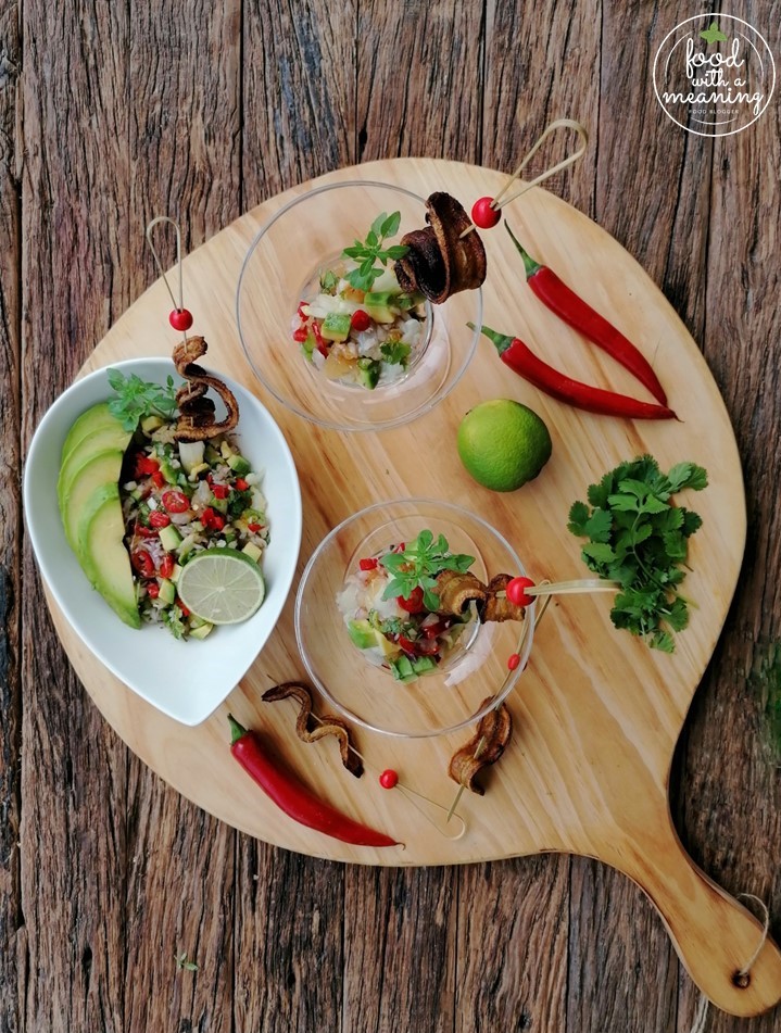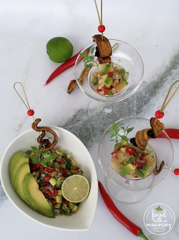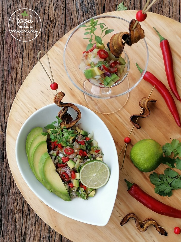 Salada de Veja Defumada com Chips de Banana, Abacate e Mel dos Açores