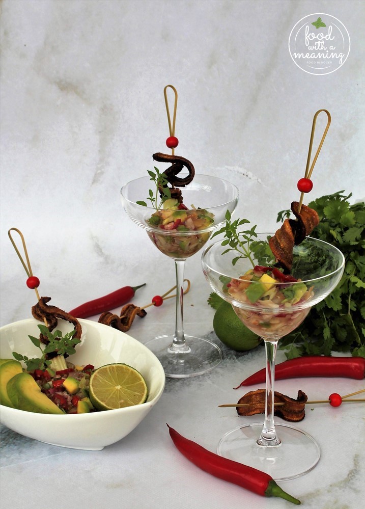 Sirva a salada numa tigela ou em copos de pé individuais, acompanhada com os palitos com chips de banana.