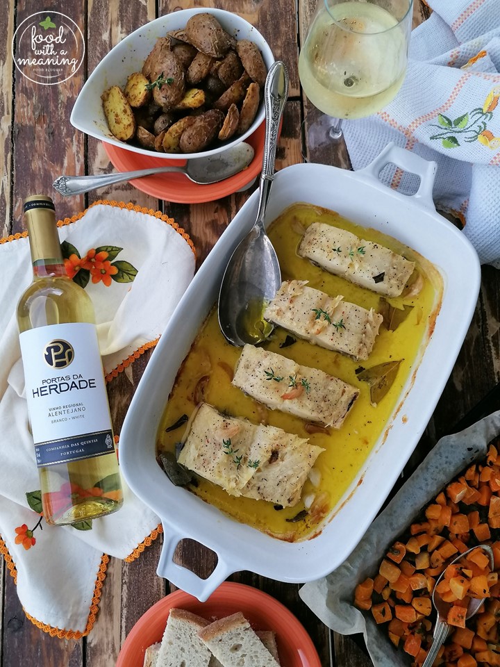 Hoje, da minha cozinha, saiu este Bacalhau Confitado, que foi acompanhado com Portas da Herdade branco.