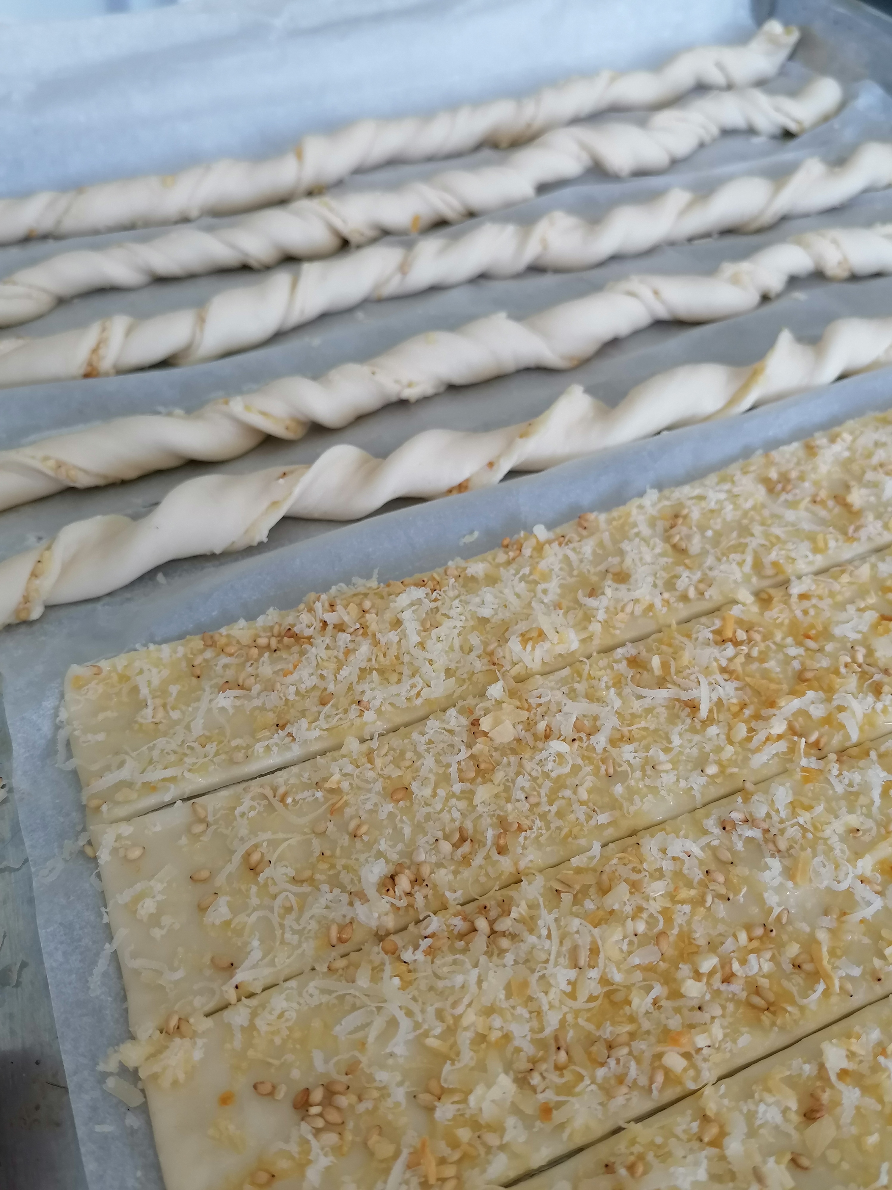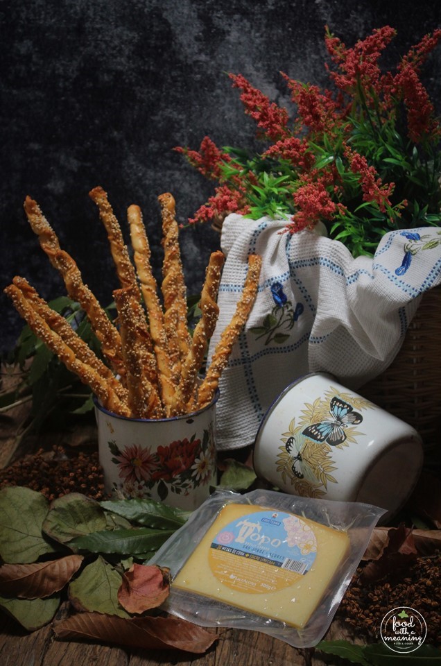 Os gressinos da foto foram recheados com Queijo Topo 36 meses de cura, flocos de cebola desidratada e sementes de sésamo.