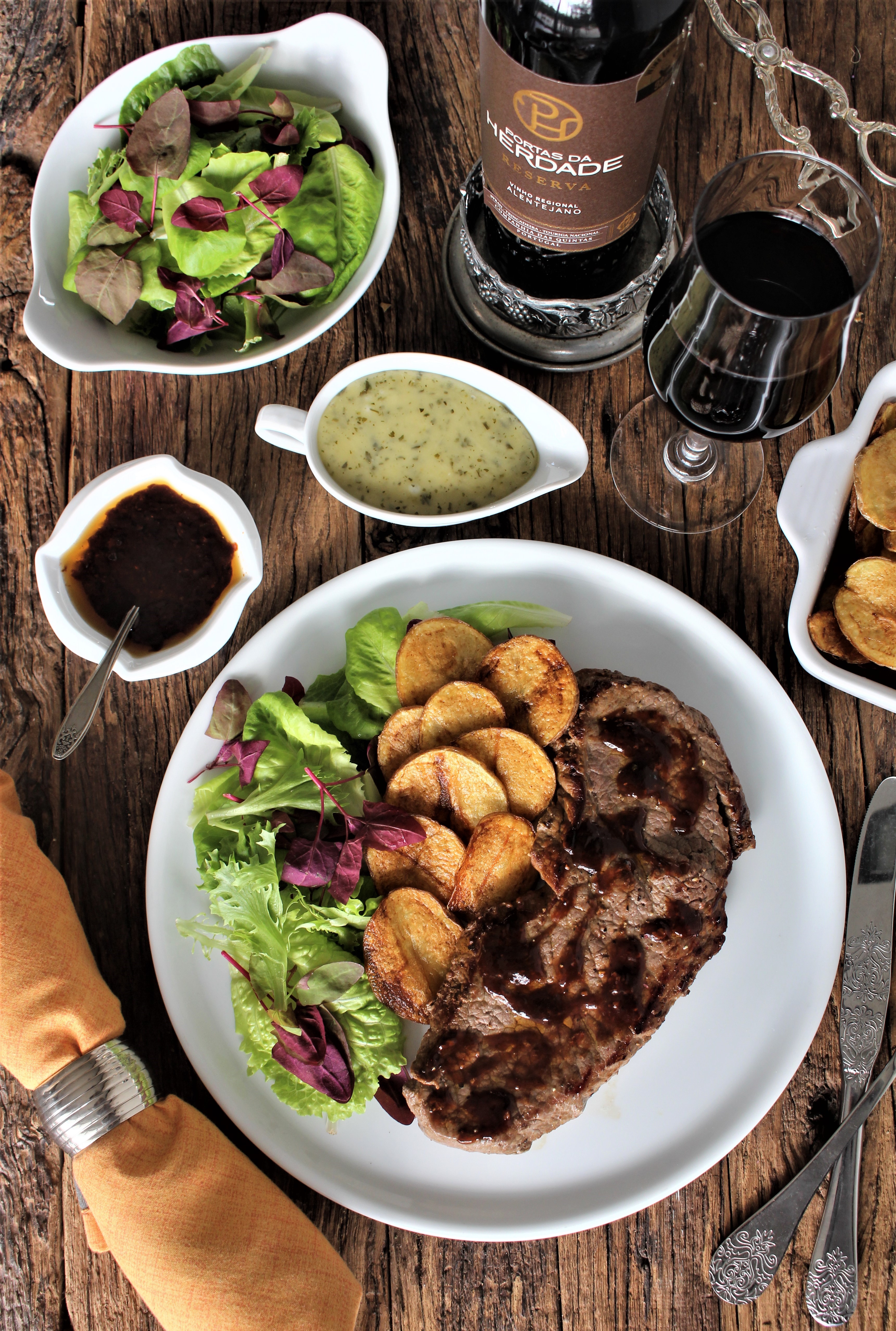 Optámos pelo tinto Portas da Herdade Reserva (40% Syrah; 30% Trincadeira; 30% Touriga Nacional), de cor rubi intensa, aroma intenso e complexo, ideal para acompanhar carnes vermelhas e queijos curados.