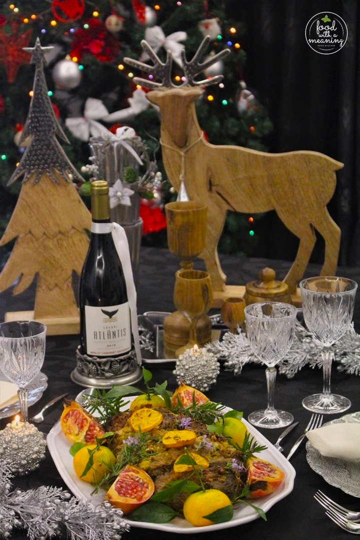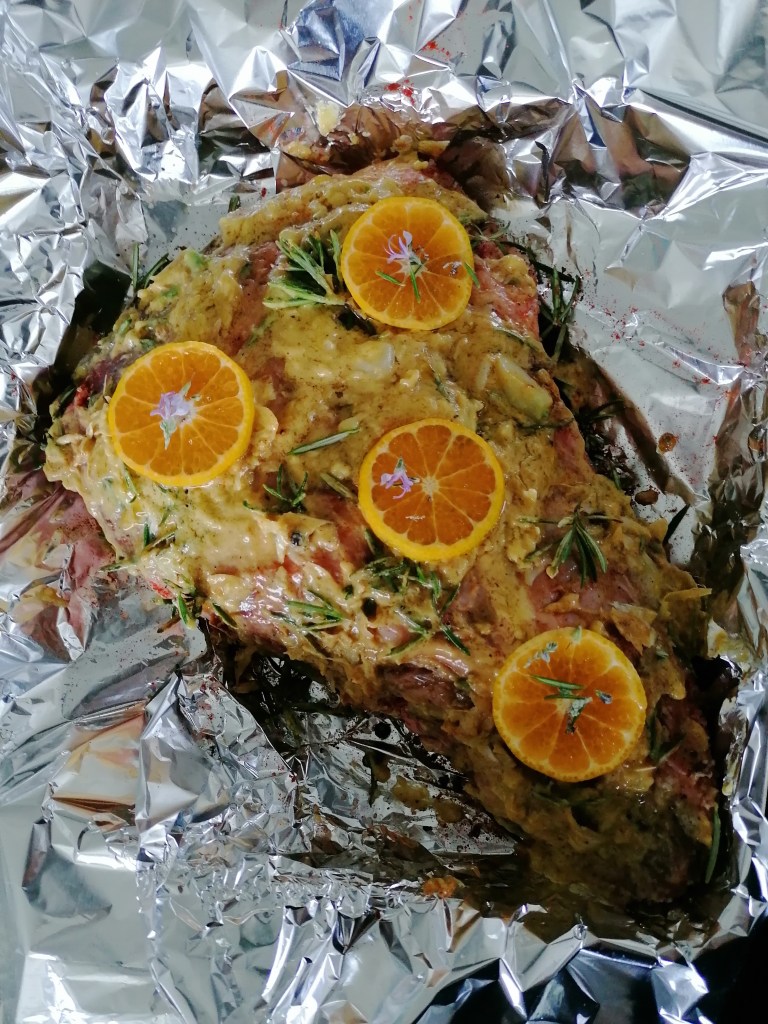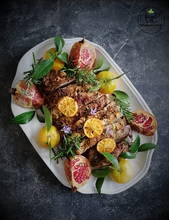 Retire a carne para uma tábua de corte e fatie-a a gosto. Coloque-a de seguida numa travessa, decorada com tangerinas, pedaços de romã e raminhos de alecrim.