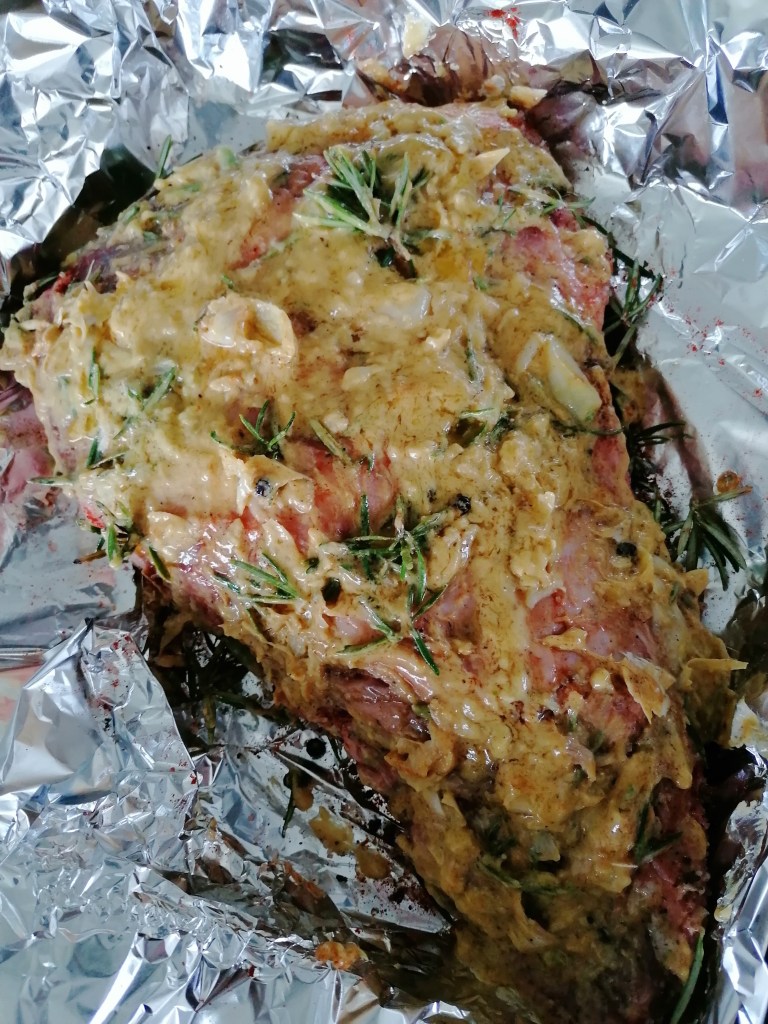 Corte 2 folhas de papel de alumínio e disponha-as na assadeira. Estas terão de ter o tamanho suficiente para depois fechar a carne, como se de um papelote de tratasse. (ver imagens abaixo).