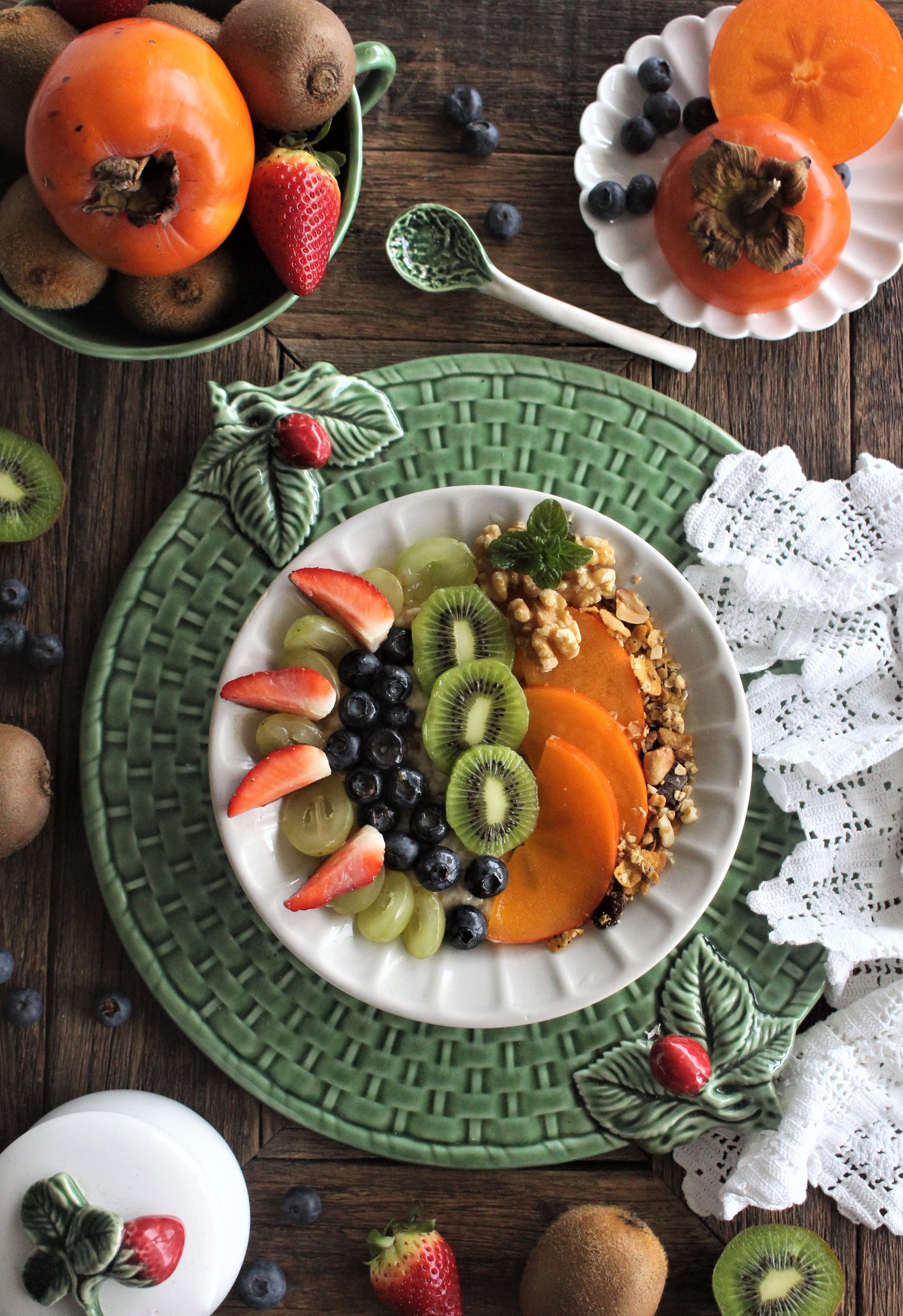 - fruta variada (dióspiros, mirtilos, morangos, uvas e kiwis)