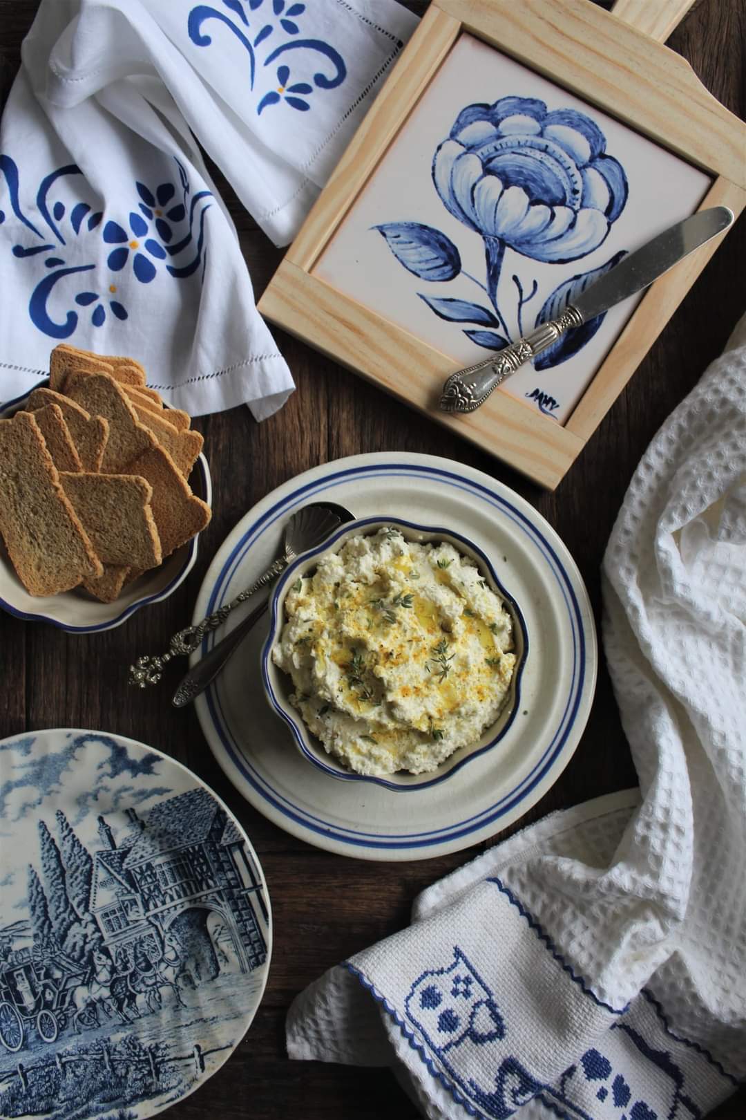 Misture o requeijão com o queijo creme e a cebola desidratada. Envolva tudo com um fio de azeite e guarneça com uns pozinhos de caril e folhinhas de tomilho fresco.
