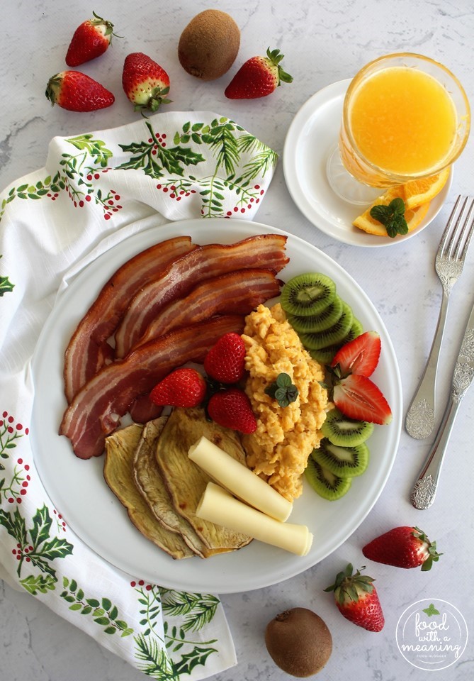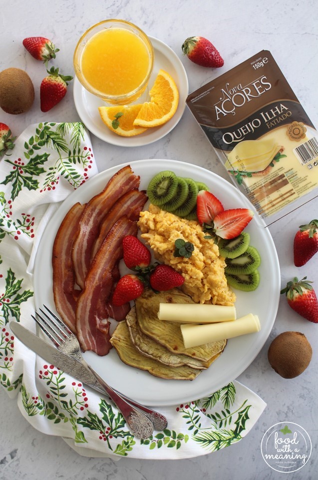 Ovos mexidos com bacon, queijo fatiado, batata-doce, fruta e sumo natural de laranja