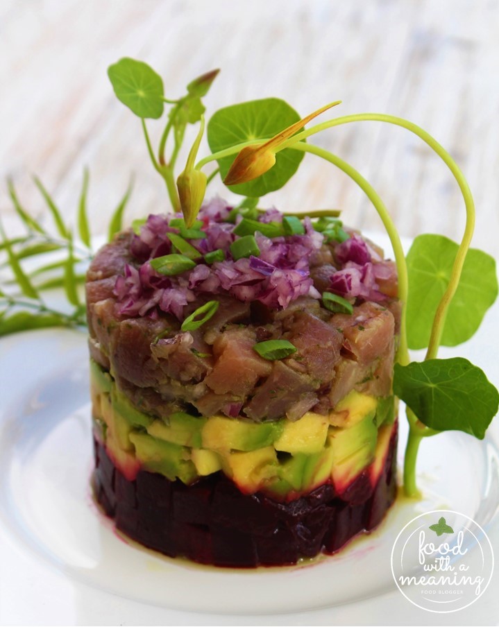 - Para servir, coloque um aro metálico de 8 cm de diâmetro e 10 cm de altura no meio de cada prato. Disponha em primeiro lugar a beterraba, formando uma camada uniforme. Em segundo lugar, coloque o abacate aos cubos e, por fim, o tártaro de atum defumado. Comprima tudo com uma colher e remova suavemente o anel metálico. Decore com sobras de cebola e cebolinho picados e com folhas de capuchinhas. Finalize com um fio de azeite e pimenta preta moída na hora.