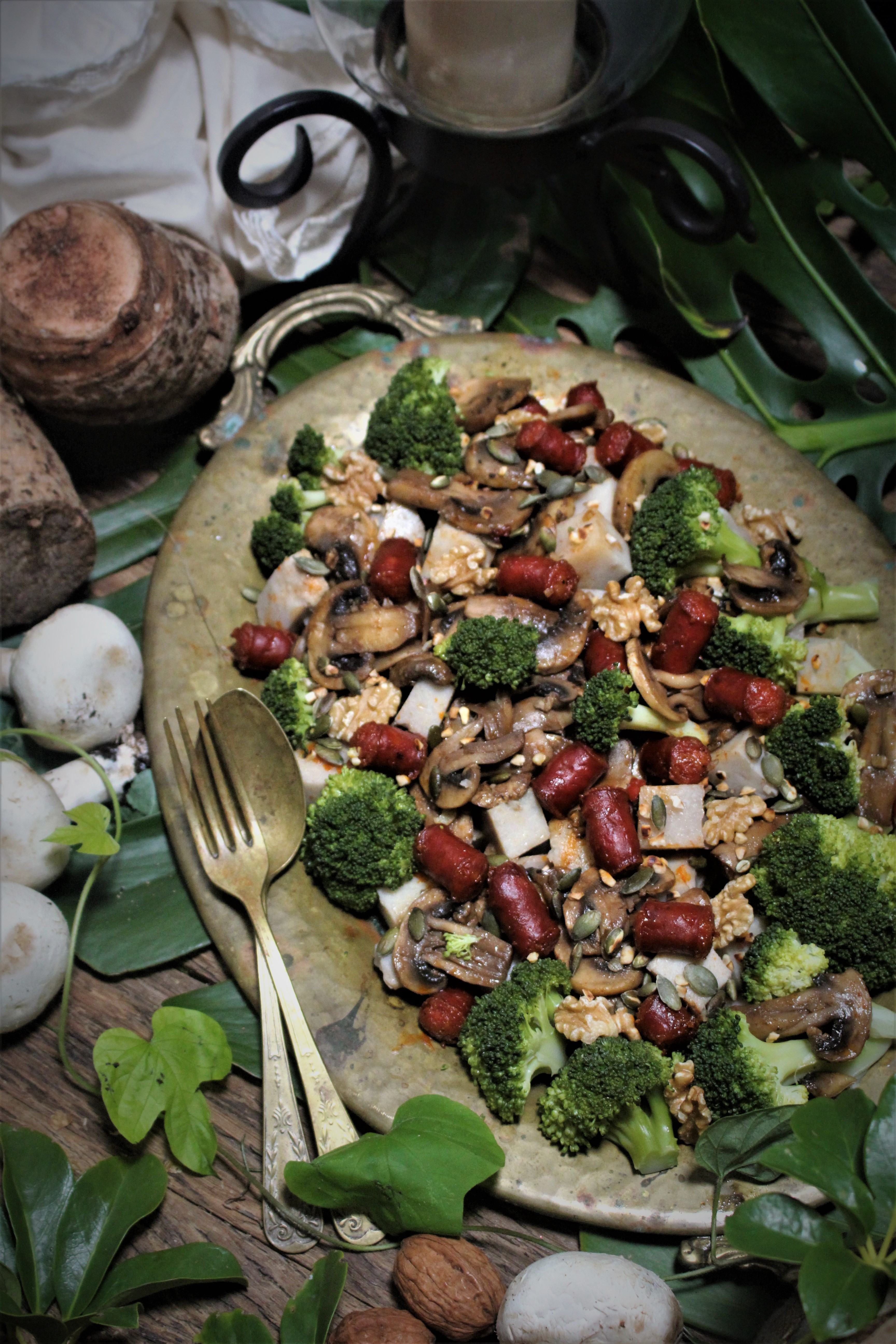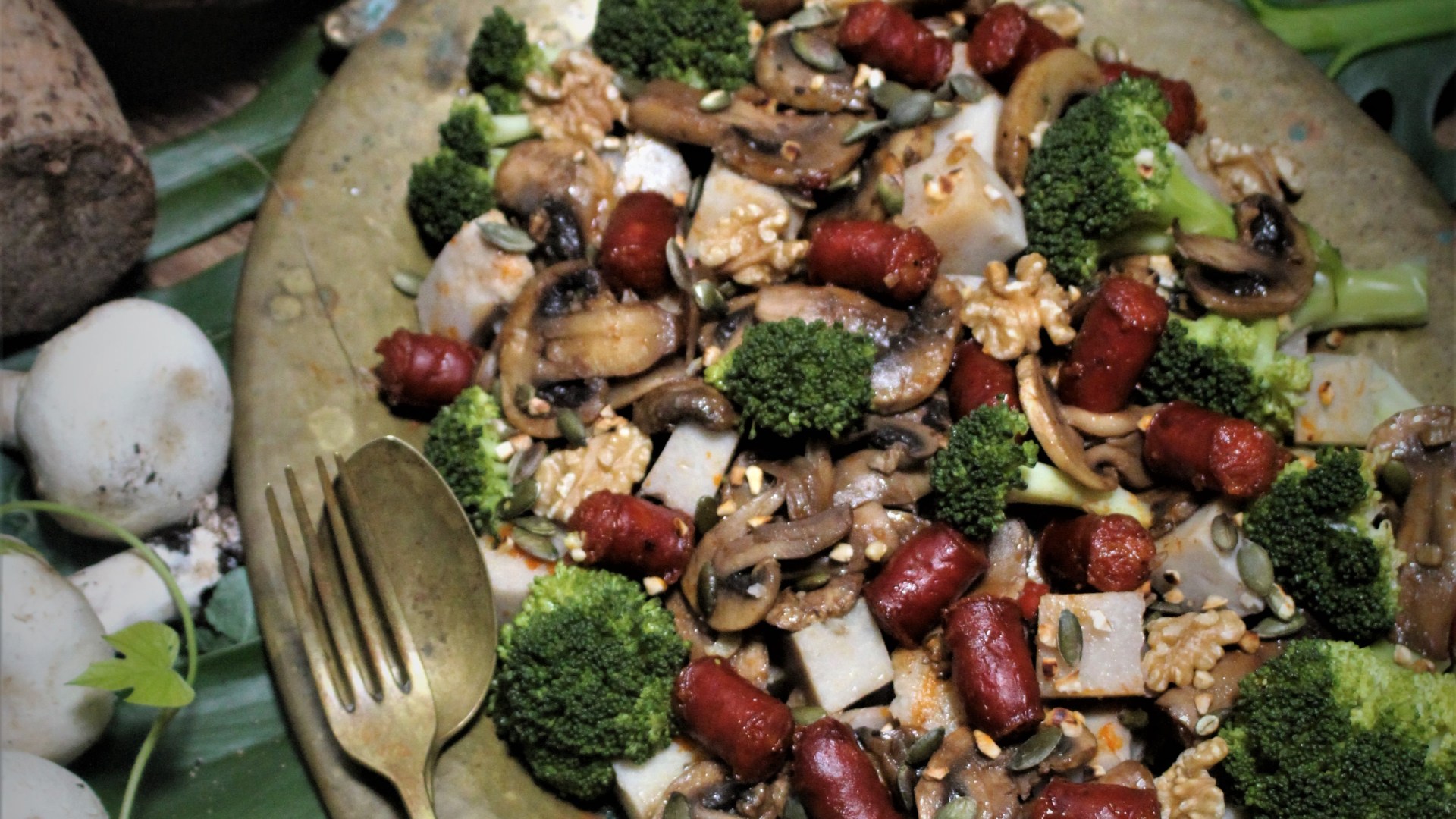 Salada de Inverno com Inhame, linguiça, cogumelos e brócolos
