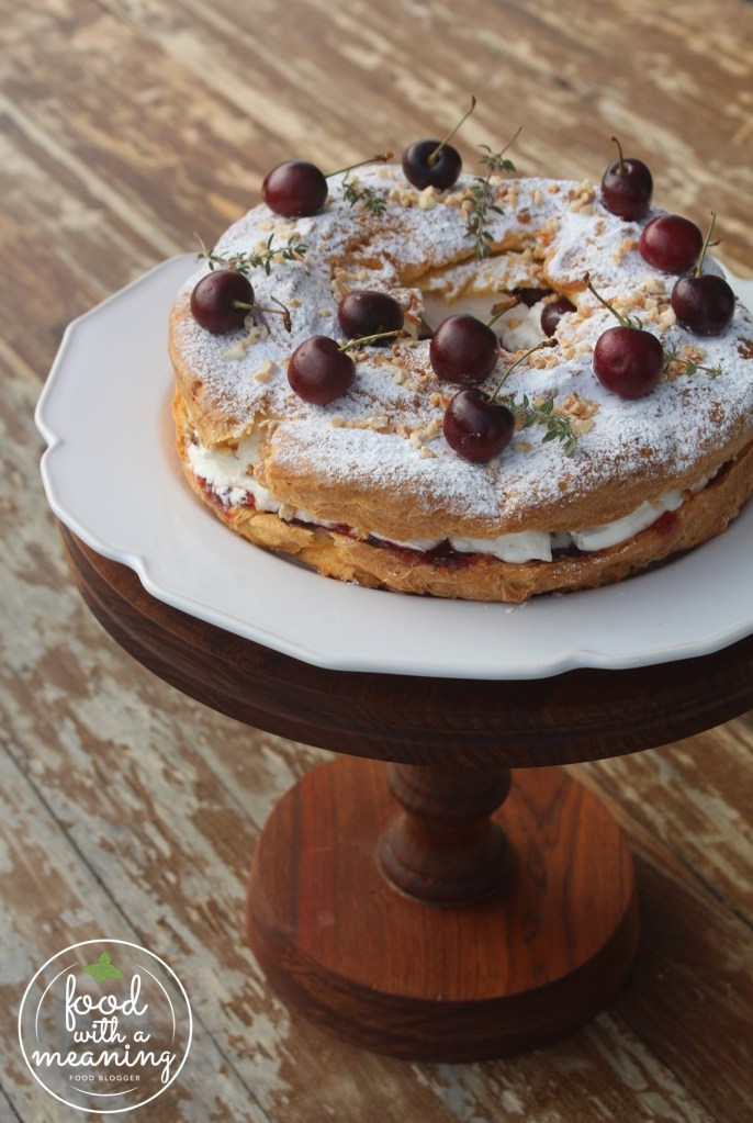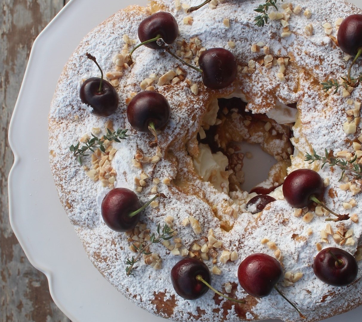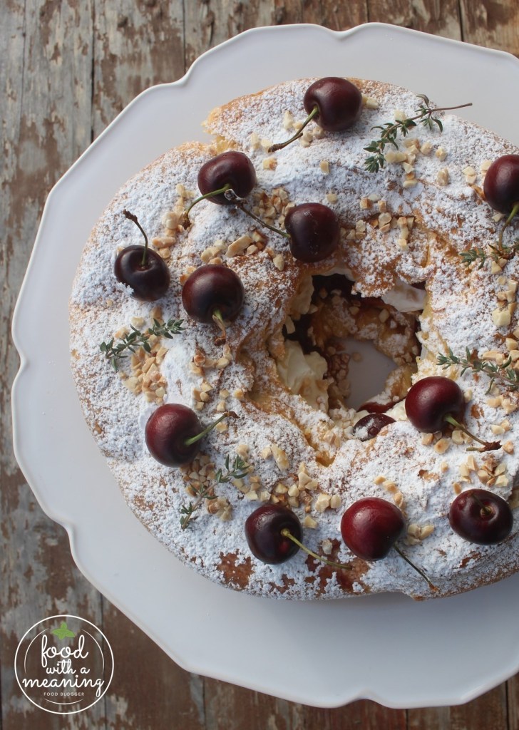 Polvilhe com açúcar em pó e disponha as cerejas e a amêndoa torrada.
