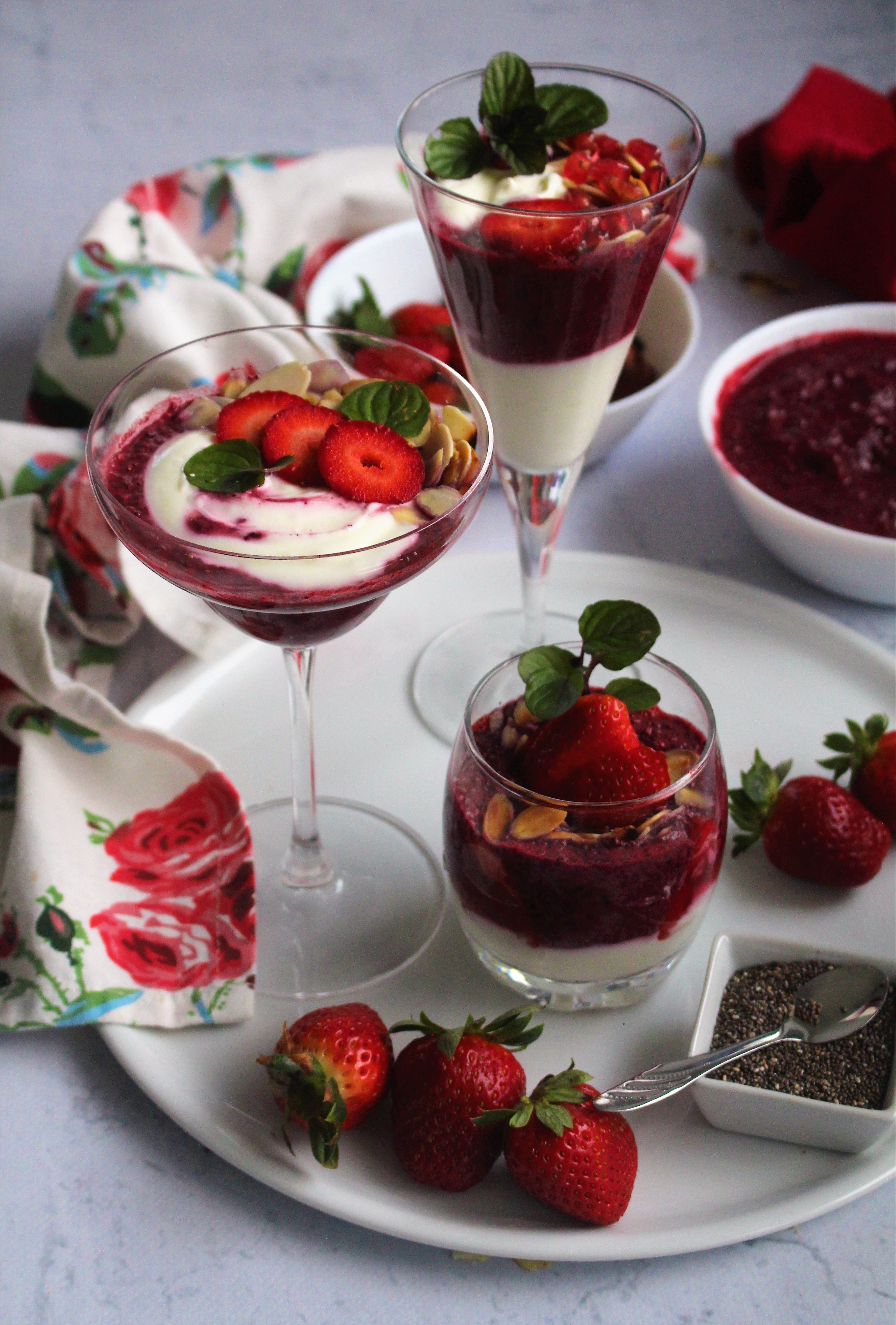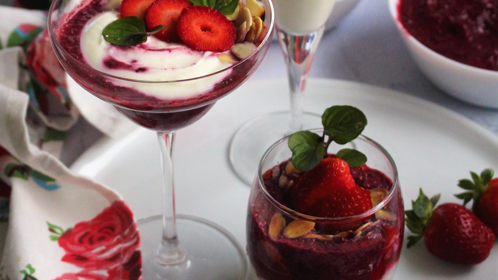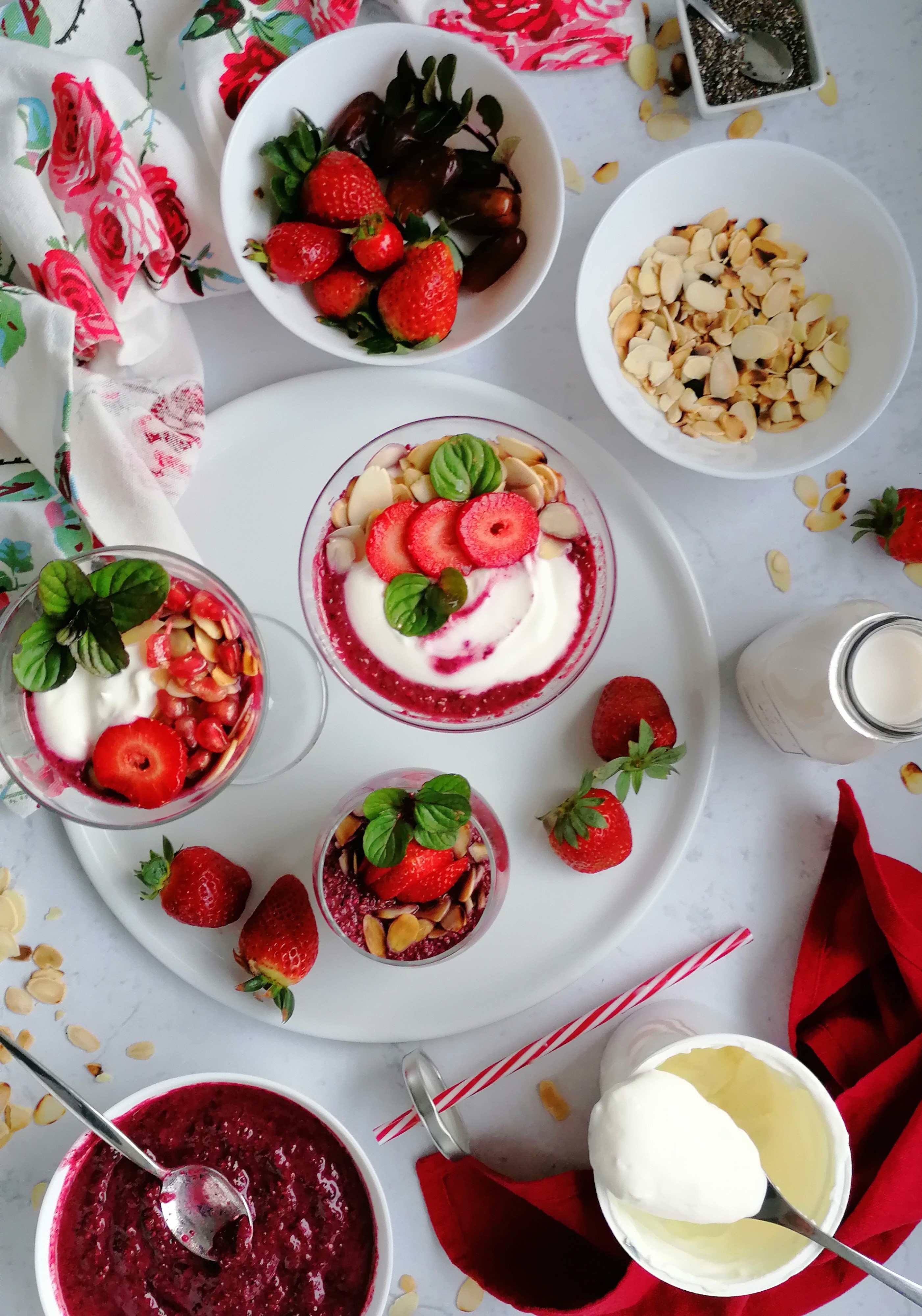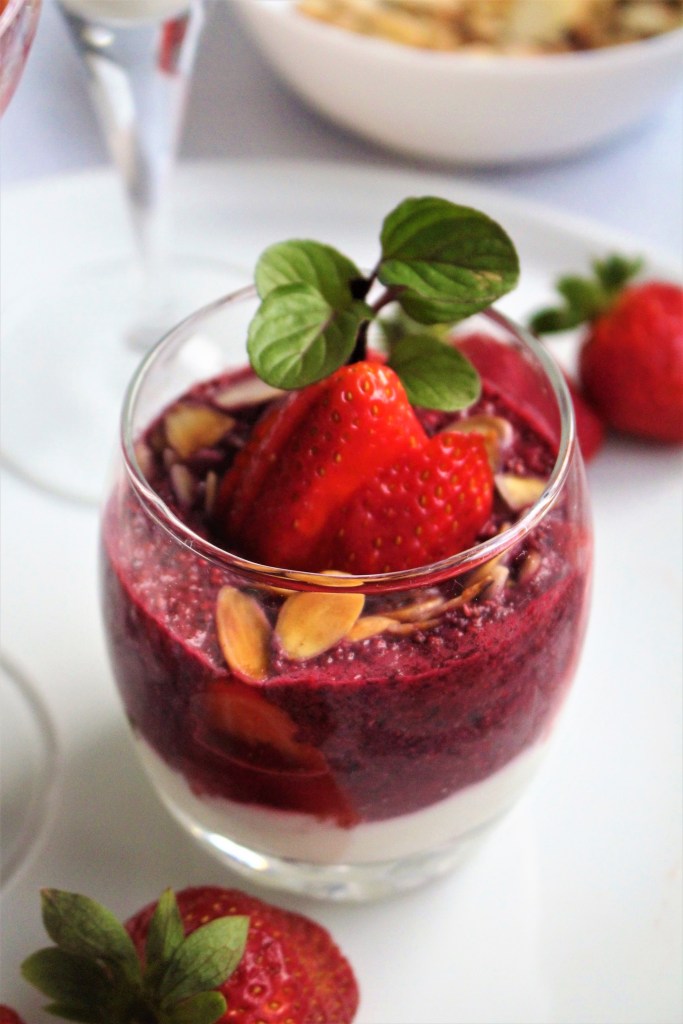 Triturem frutos vermelhos congelados com um pouco de leite ou de bebida vegetal (pouco) , mel e juntem sementes de chia. Mexam e deixem repousar 15 a 10 minutos. Misturem no iogurte um pouco de aroma de baunilha. Coloquem o iogurte no fundo de um copo ou taça. Em cima, disponham uma camada do preparado de frutos vermelhos. Terminem com uma colherzinha de iogurte, fruta fresca e amêndoa torrada.