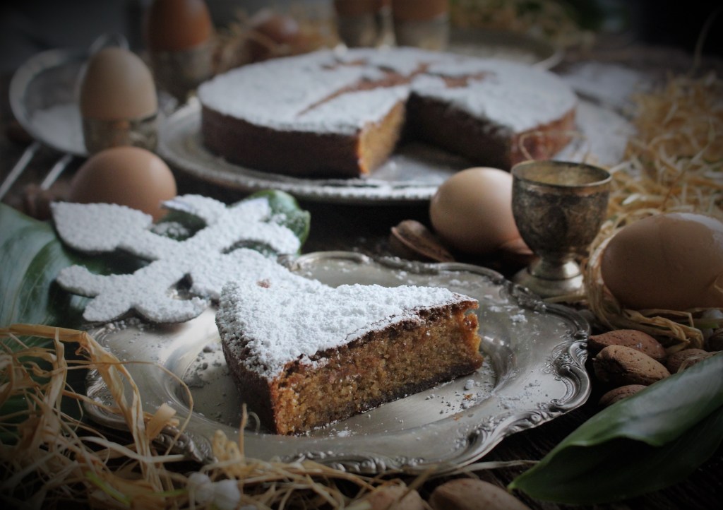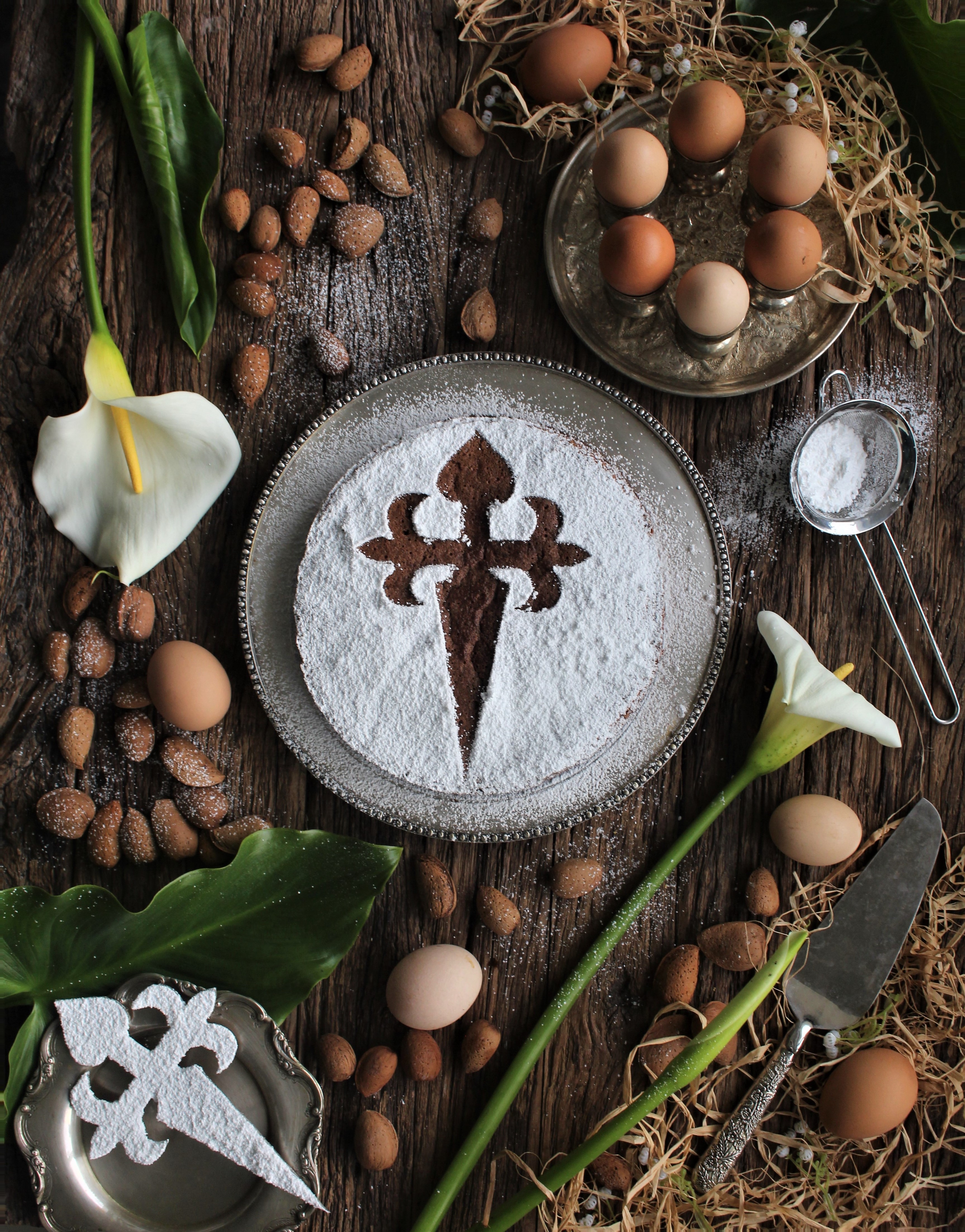 A Tarte de Santiago é uma sobremesa tradicional da Galiza, na Espanha. É, mais concretamente, oriunda da capital galega, Santiago de Compostela, podendo ser encontrada por toda a Espanha. Os ingredientes principais deste doce são a amêndoa e os ovos, daí eu a ter escolhido como uma das sobremesas desta Páscoa.Não se sabe nada sobre o consumo de amêndoa na Galiza durante a Idade Média, mas sabe-se que a escassez deste alimento converteu-o num luxo reservado a poucos. A primeira notícia que se tem do uso deste “biscoito de amêndoa”, que atualmente se conhece como Tarte de Santiago, data de 1577, durante uma visita de D. Pedro de Portocarrero à Universidade de Santiago de Compostela, ainda que naquela altura fosse denominada “tarte real”. A elaboração e a proporção dos ingredientes lembra a atual Tarte de Santiago. As primeiras receitas fiáveis provêm de notas de Luis Bartolomé de Leybar, datando de 1838, sob a designação de “Tarte de Amêndoa”.A origem da Cruz de Santiago representada na sua superfície data de 1924, ano em que a confeitaria «Casa Mora» de Santiago de Compostela começa a enfeitar as tartes de amêndoa com aquela que viria a ser a sua silhueta característica.Em 3 de Março de 2006, a Tarte de Santiago passou a ser uma Denominação de origem protegida.