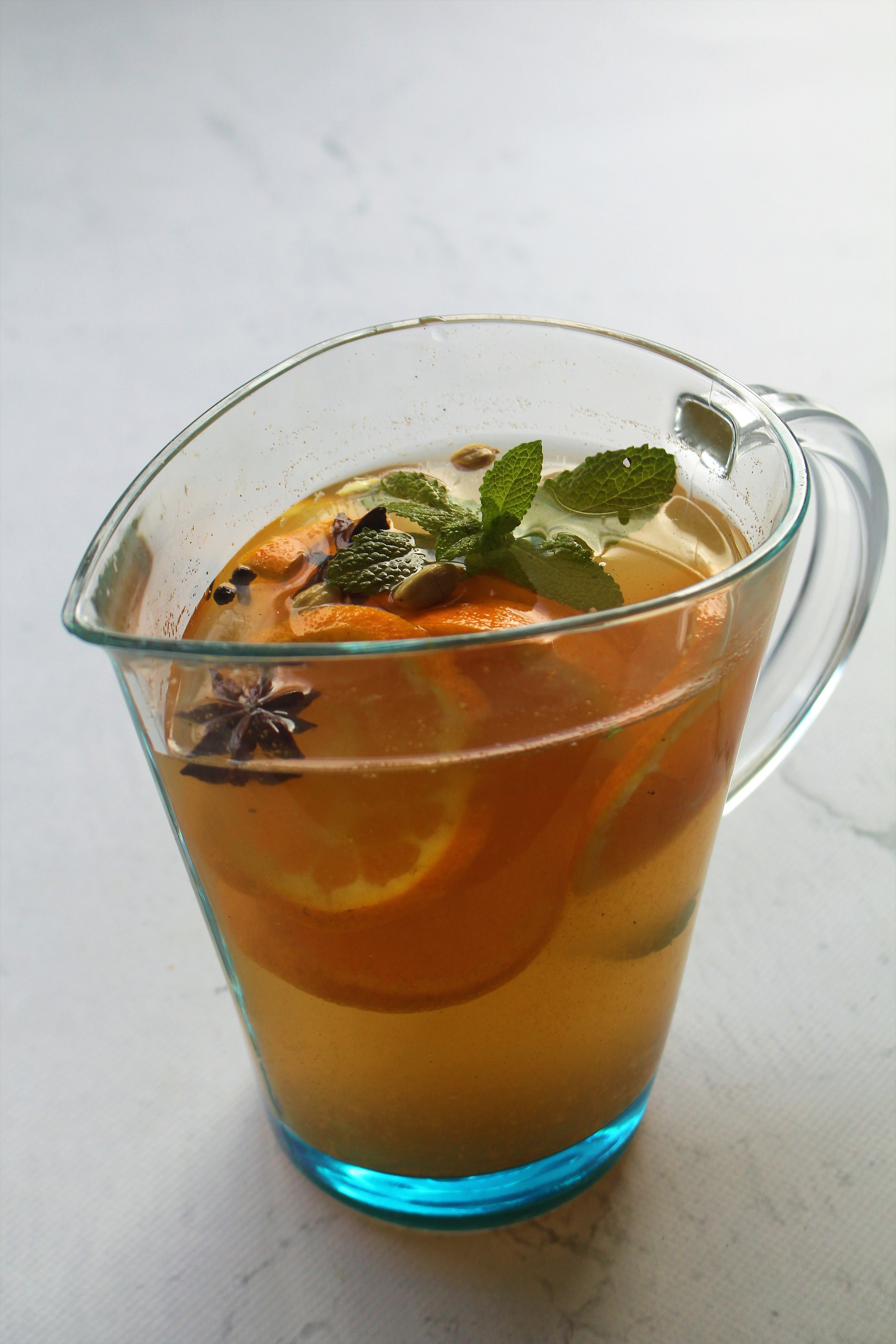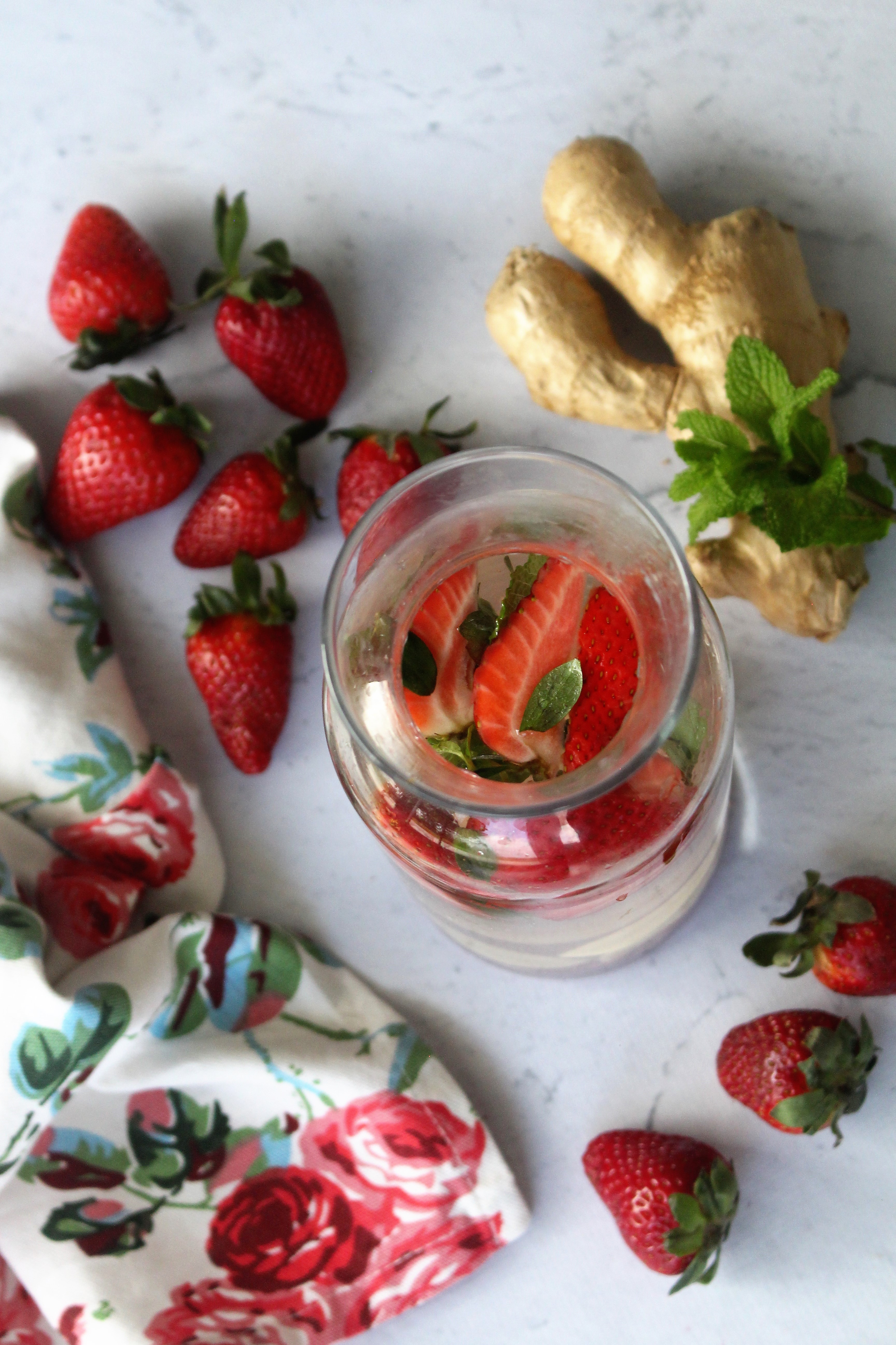 Junte bagos de romã, hortelã e 1 pedaço de gengibre descascado laminado.