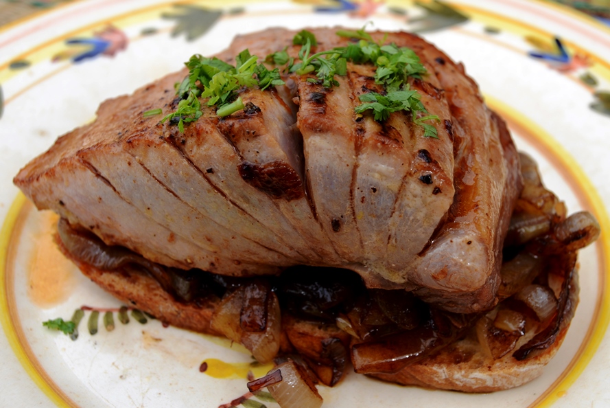 Disponha esta caramelização por cima das 4 porções de atum e, se necessário, regue com mais um fio de azeite.