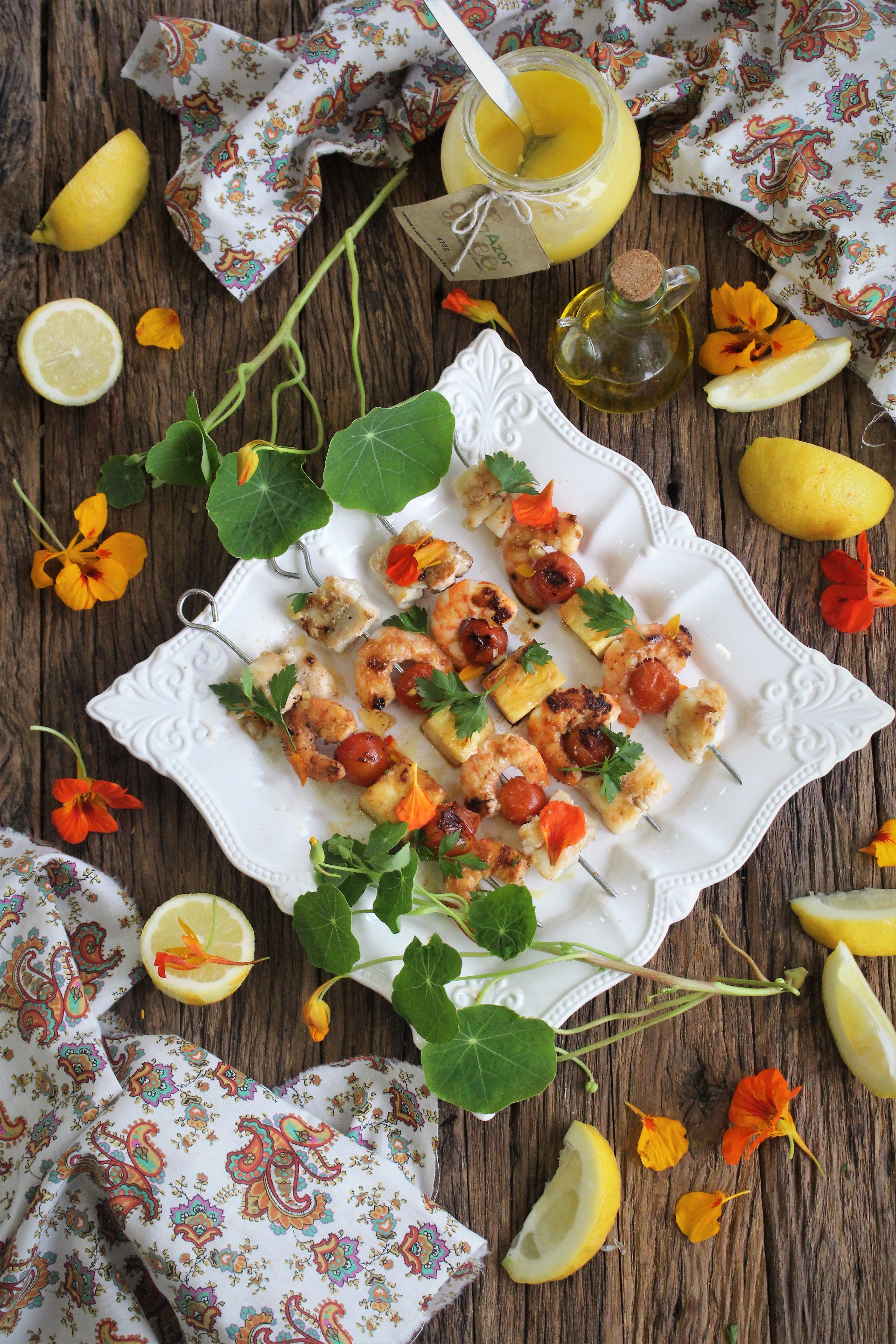Espetadas de tamboril, camarão e ananás