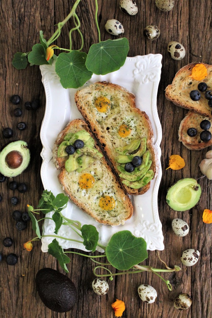 Fatias de Pão com alho, ervas, queijo São Jorge, ovos de codorniz e abacate