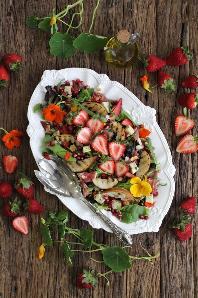 Salada de Folhas Verdes com Pera Grelhada, Presunto, Queijo Alho e Salsa, Romã e Amêndoa
