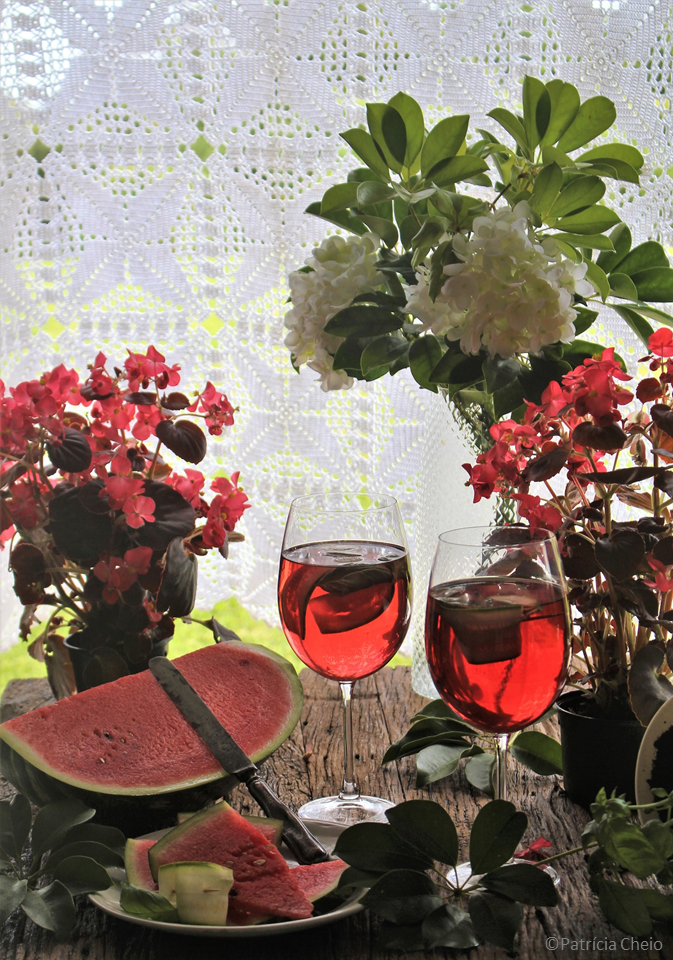 Junte-lhe sumo de melancia a gosto, sem a polpa. Se não tiver máquina de sumos, triture a polpa (sem as pevides) no copo da varinha mágica, no robô de cozinha ou no liquidificador e coe para o recipiente onde tem o chá de hibisco. Prove e veja se deseja adoçar com stévia, mel ou com açúcar de coco. Existem melancias mais doces do que outras, o que condiciona o equilíbrio desejado.