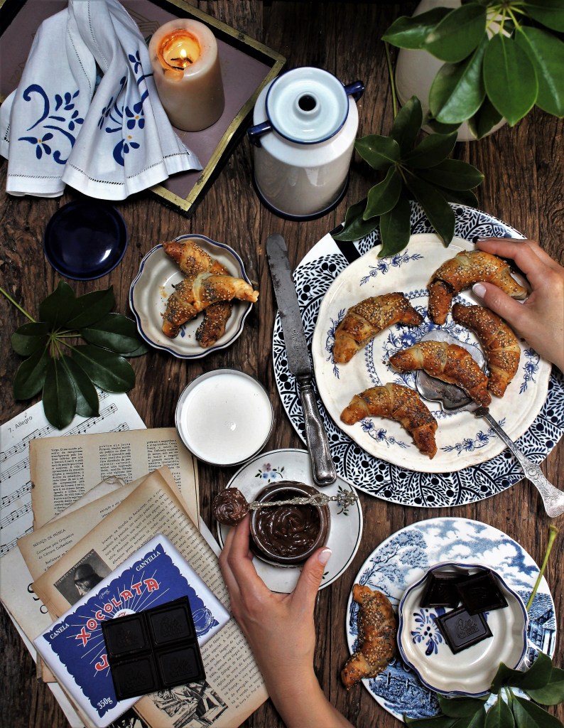 Das coisas de que mais gosto de fazer é preparar as mesas para a fotografia do prato que acabei de preparar. Neste caso, a mesa de lanche ou de pequeno-almoço. Quem resiste a croissants de chocolate. Para manter a linha, já faço de propósito e confeciono-os pequeninos. Explico abaixo como poderão fazer a massa de raiz, mas se não tiverem tempo, comprem a massa folhada e recheiem-nos.