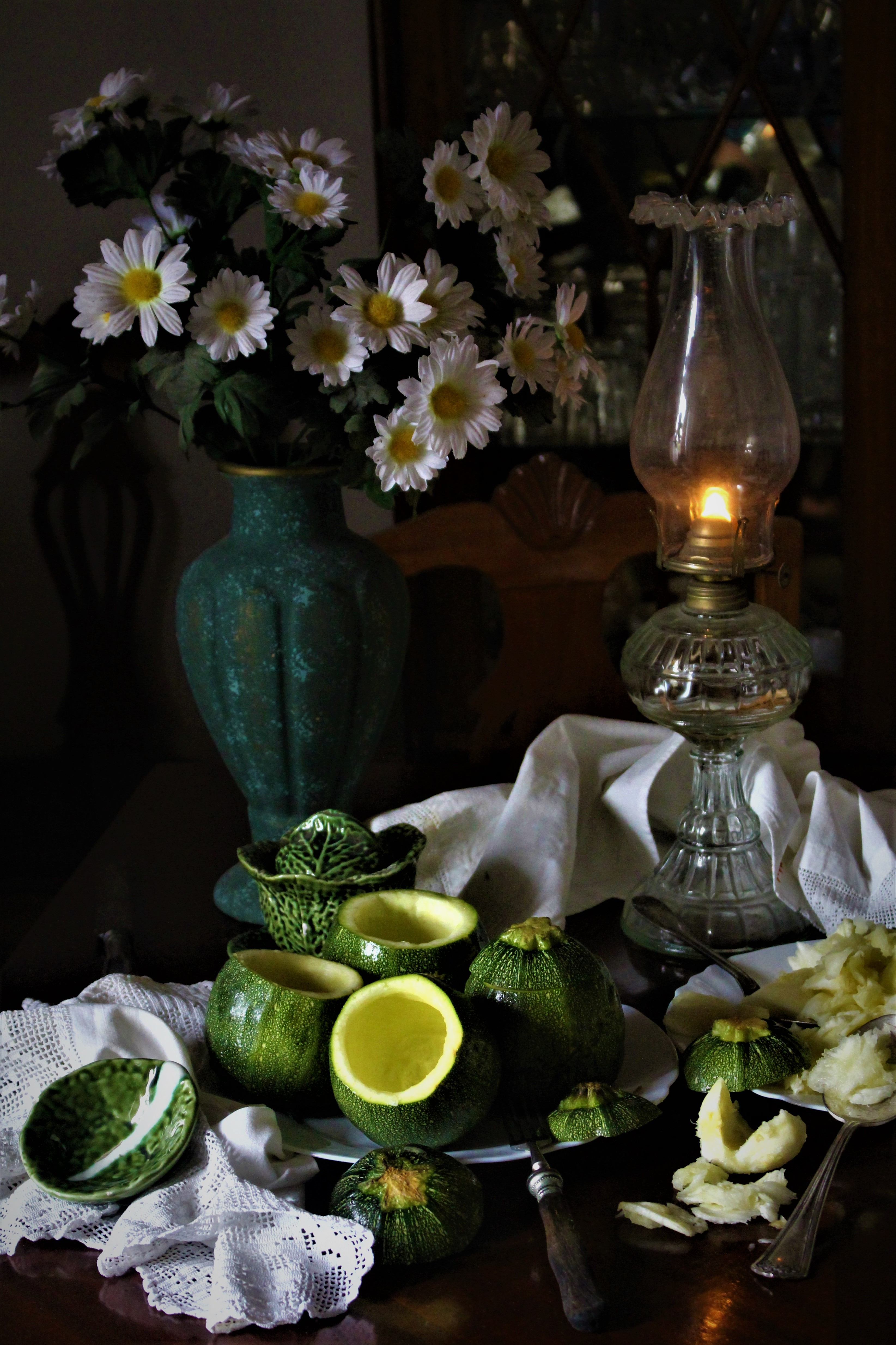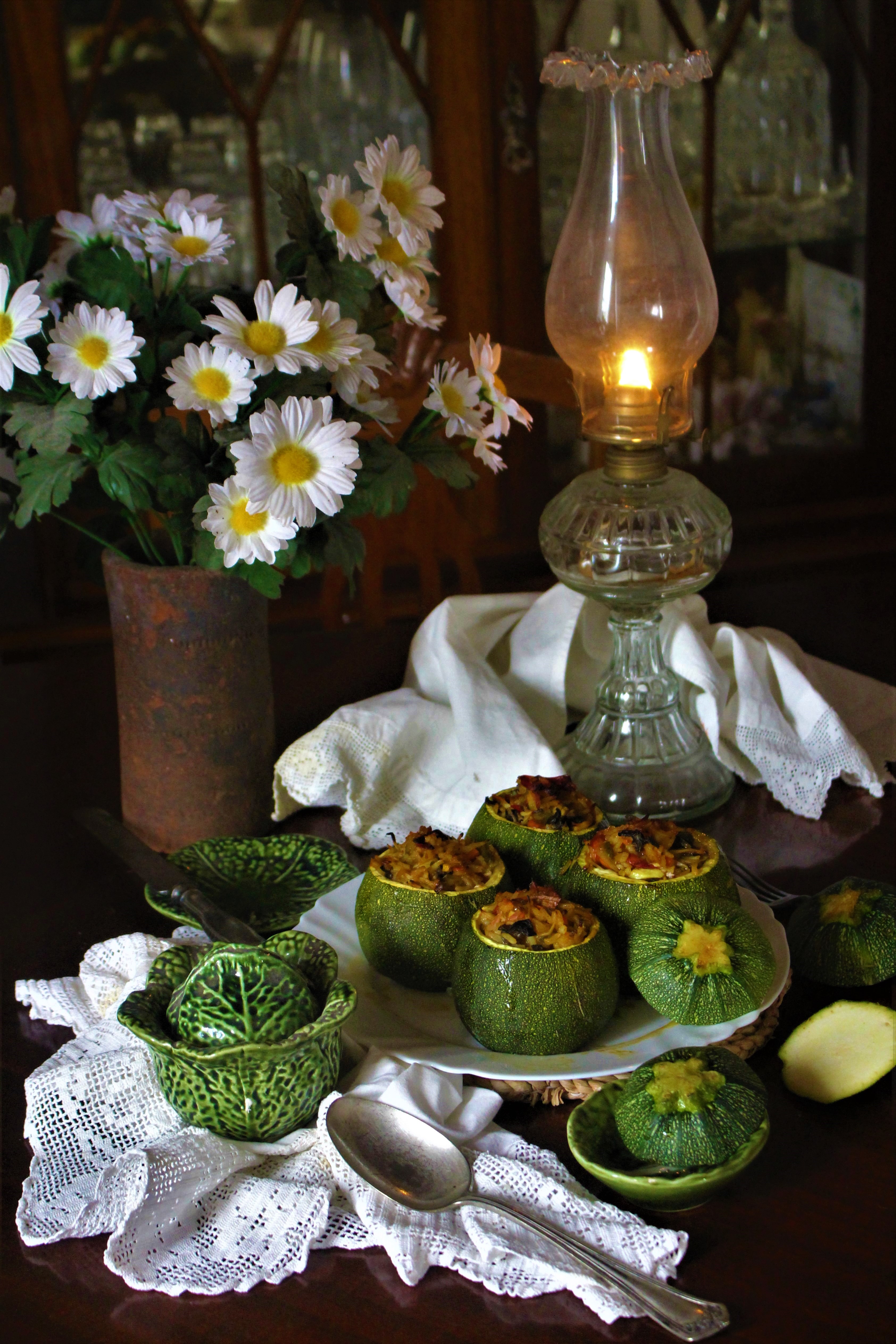 - Lavam-se as curgetes, abre-se-lhes uma tampa e retira-se a polpa, que se reserva para uma sopa ou parte para o recheio se se desejar.