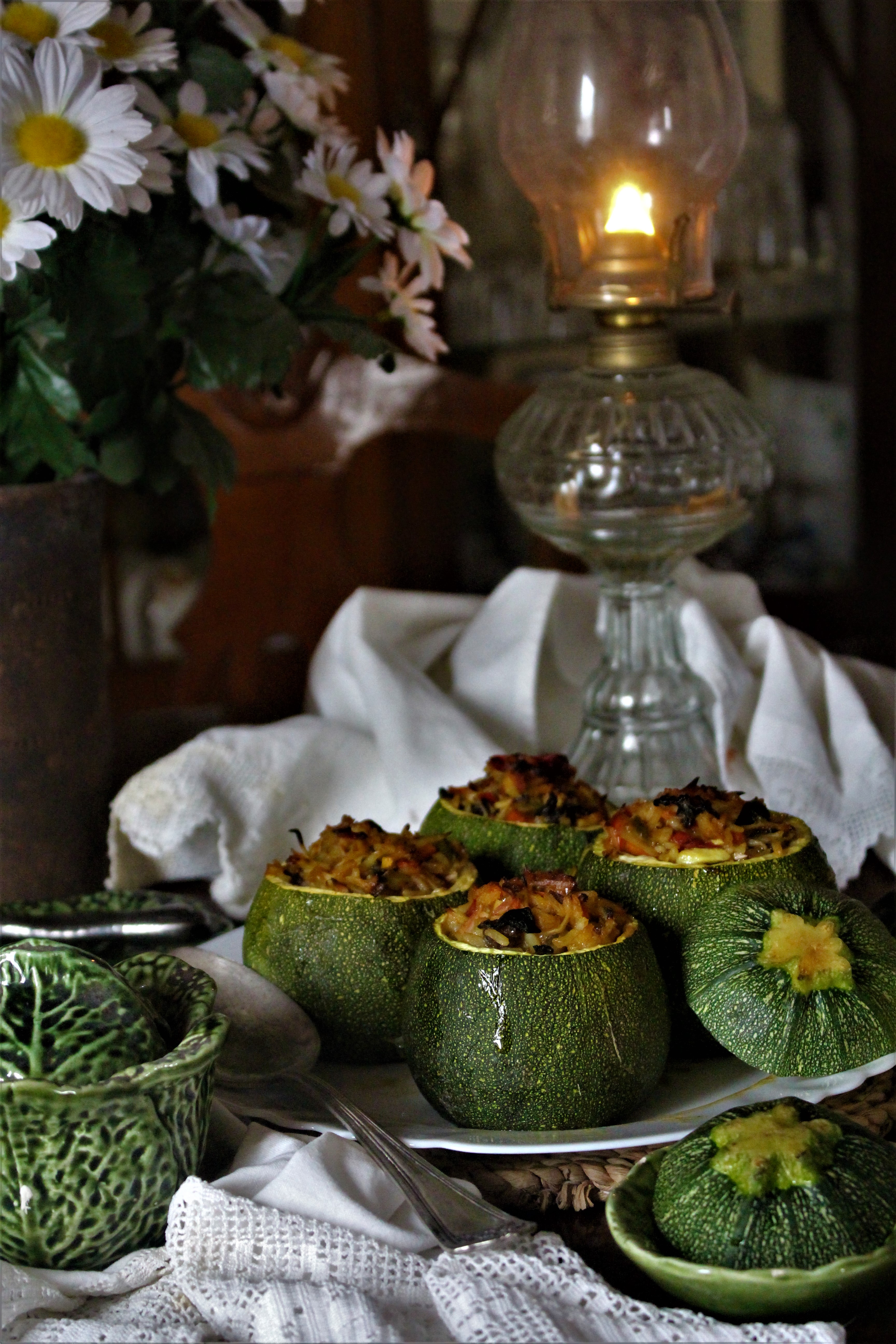 - Recheiam-se as curgetes com este preparado e levam-se ao forno numa assadeira regada com azeite até estarem assadas.