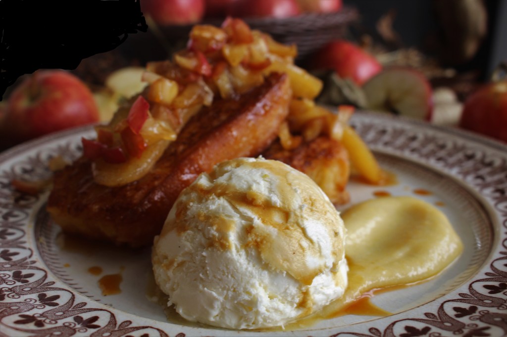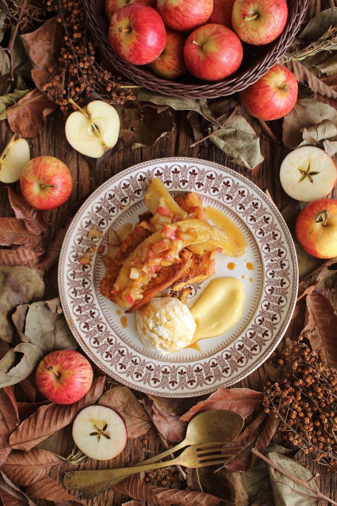 Rabanada de massa sovada com maçã e banana caramelizadas, gelado e curd de limão