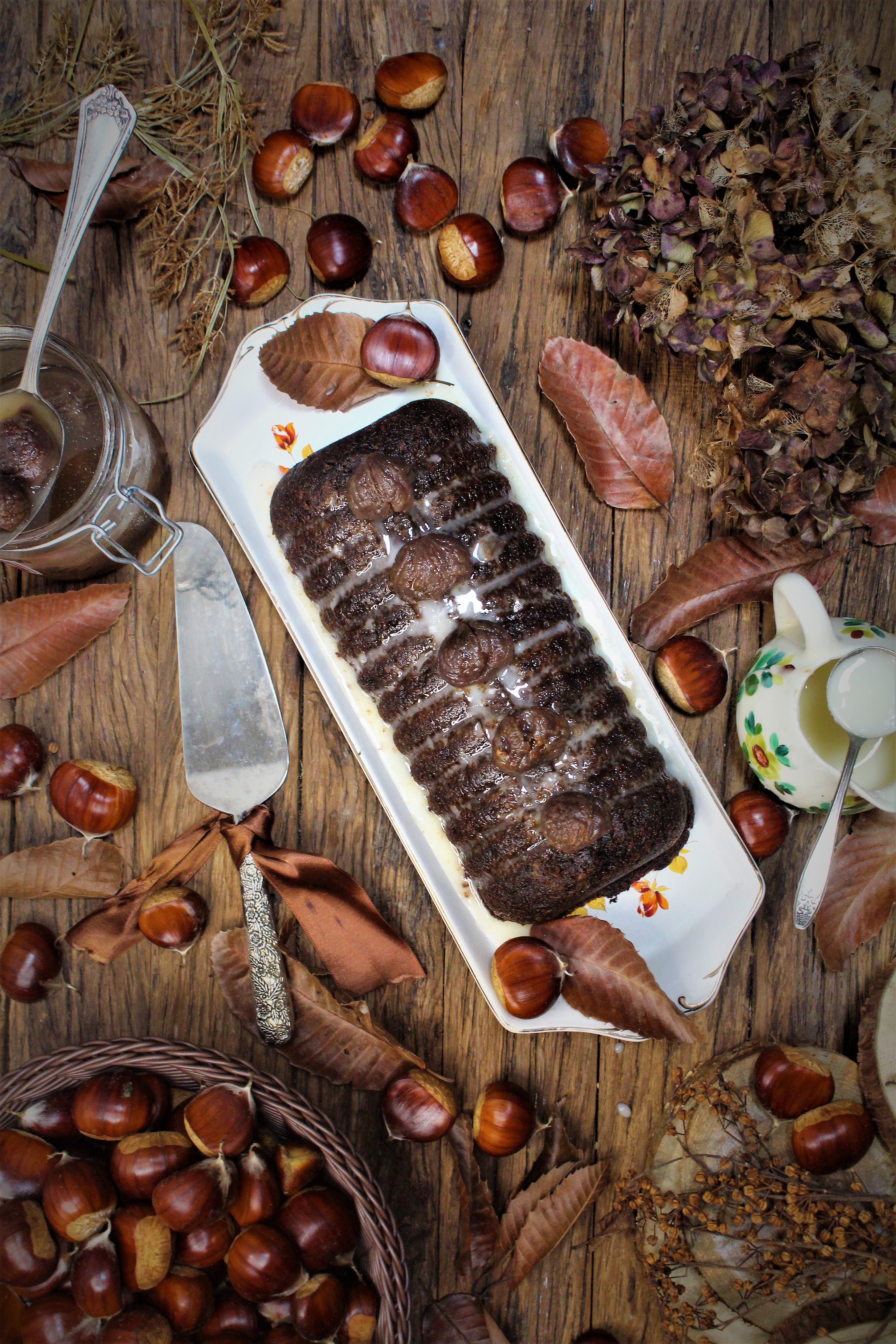 Decorei-o com um leve glacê e com castanhas glaceadas. Uma delícia!