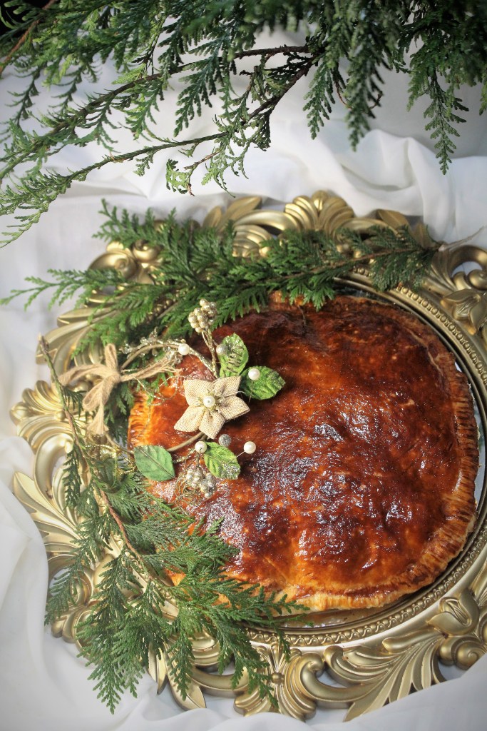 2. Num tabuleiro grande de ir ao forno, estenda uma das bases de massa sem retirar o papel. Por cima da base, espalhe o creme de forma circular e começando pelo centro. Deixe 4 cm de espaço sem creme nas extremidades para fechar a massa.
