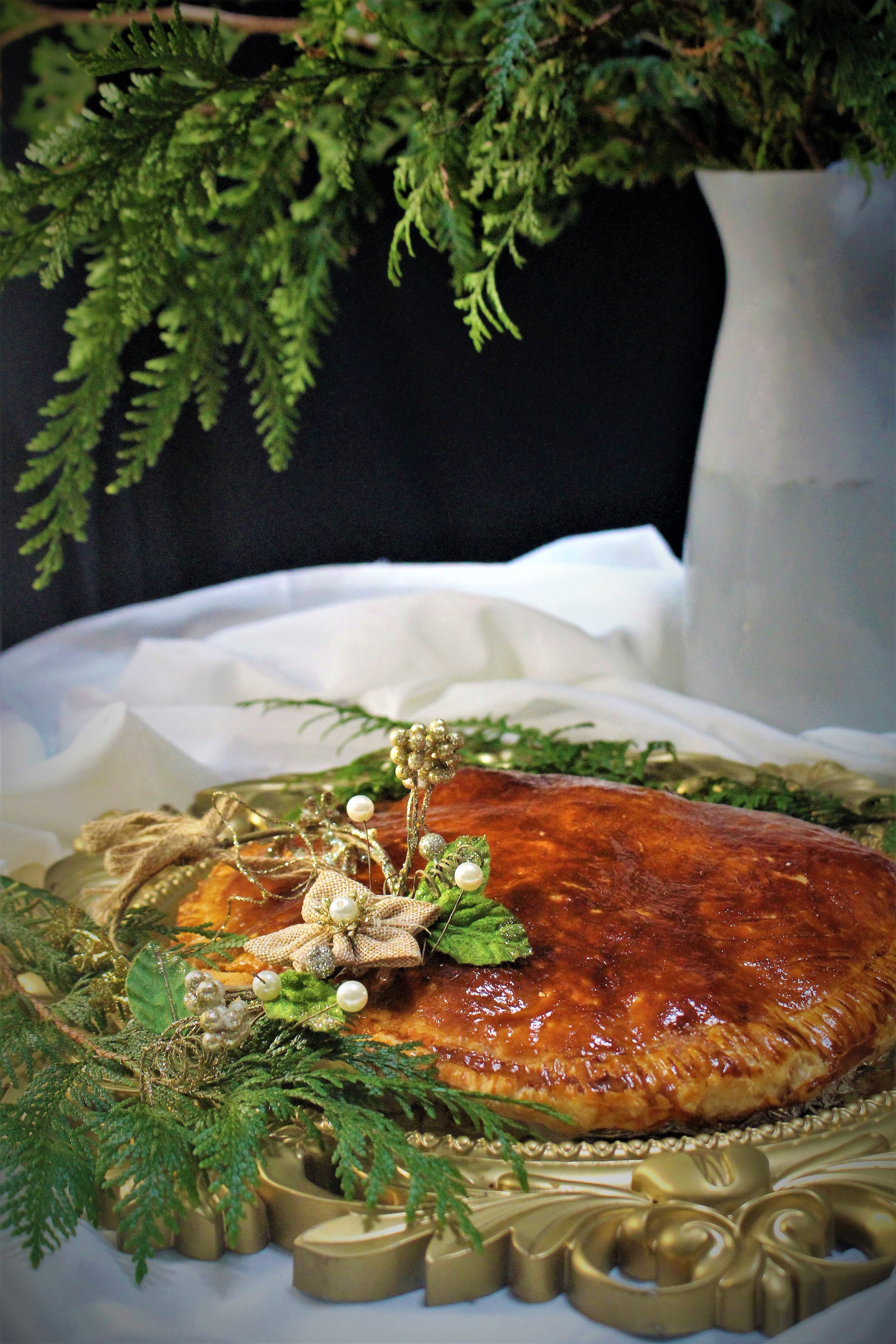 2. Num tabuleiro grande de ir ao forno, estenda uma das bases de massa sem retirar o papel. Por cima da base, espalhe o creme de forma circular e começando pelo centro. Deixe 4 cm de espaço sem creme nas extremidades para fechar a massa.