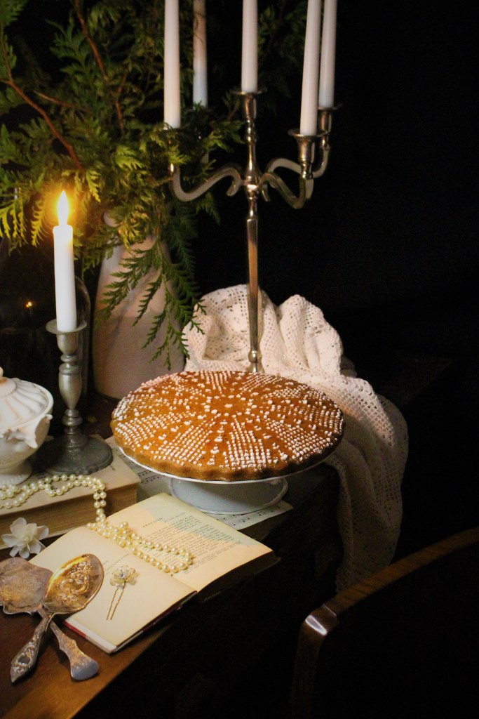 - Depois do bolo arrefecer, coloque por cima uma naperon de renda e com um coador e açúcar em pó preencha os buraquinhos de toda a renda até formar uma camada branca em todos. De seguida, levante o naperon com cuidado, isto é, sem o arrastar, e obterá um desenho bonito.