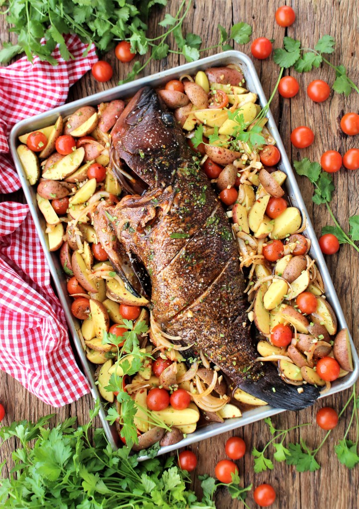 Leve ao forno cerca de 45 minutos. A meio da assadura, vire o peixe e as batatas.