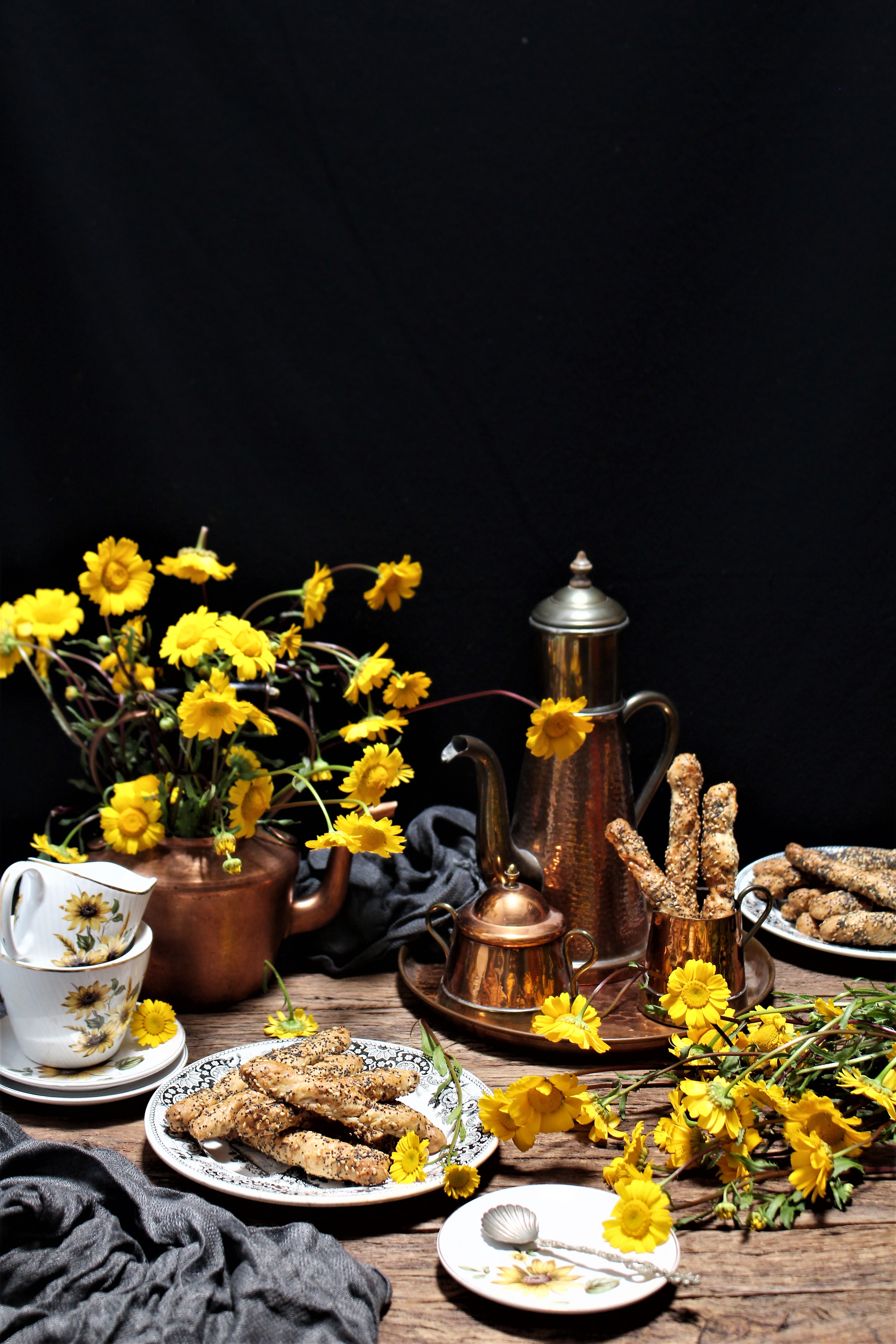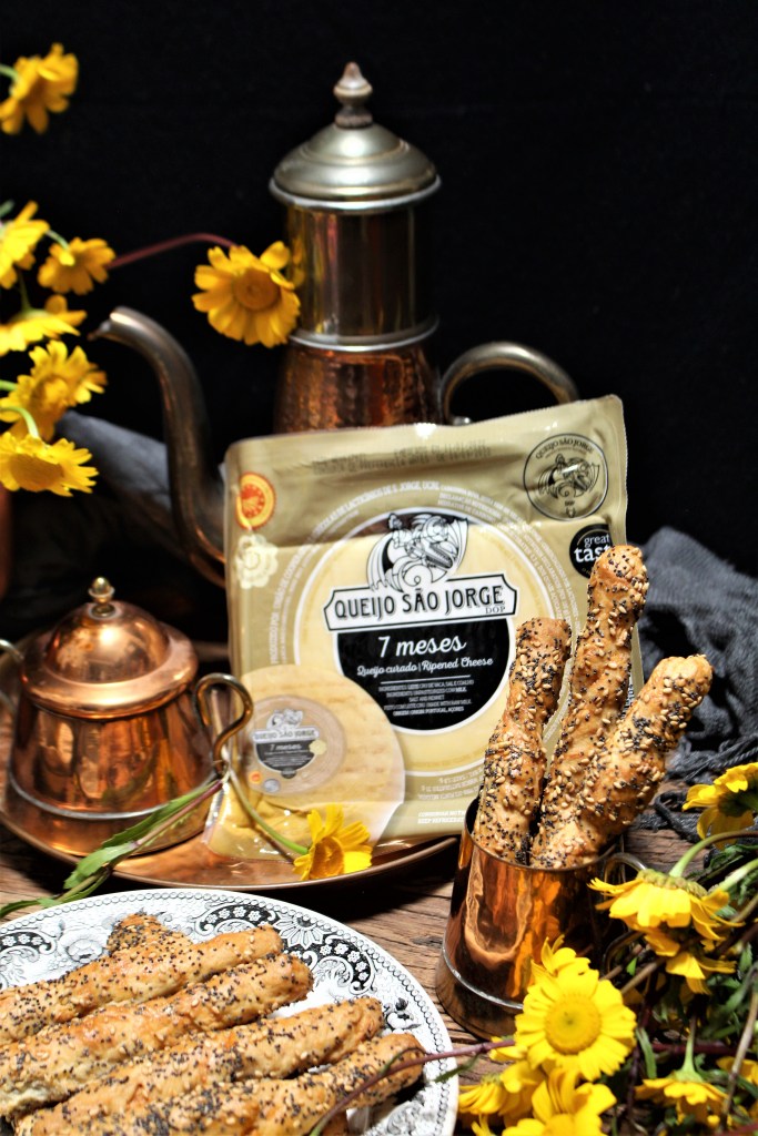 Acompanhei estes biscoitos, tipo gressinos, com fatias de queijo São Jorge DOP (7 meses) e Gluwein, bebida à base de vinho tinto, vinho do Porto, laranja e especiarias. Na base desta bebida, utilizei um blend açoriano da Curral Atlantis, com as castas Merlot e Cabernet Sauvignon.