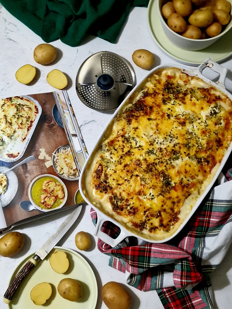 Gratinado de batata, legumes e bacon com a preciosa ajuda do descascador e protector de lâmina da Bimby.