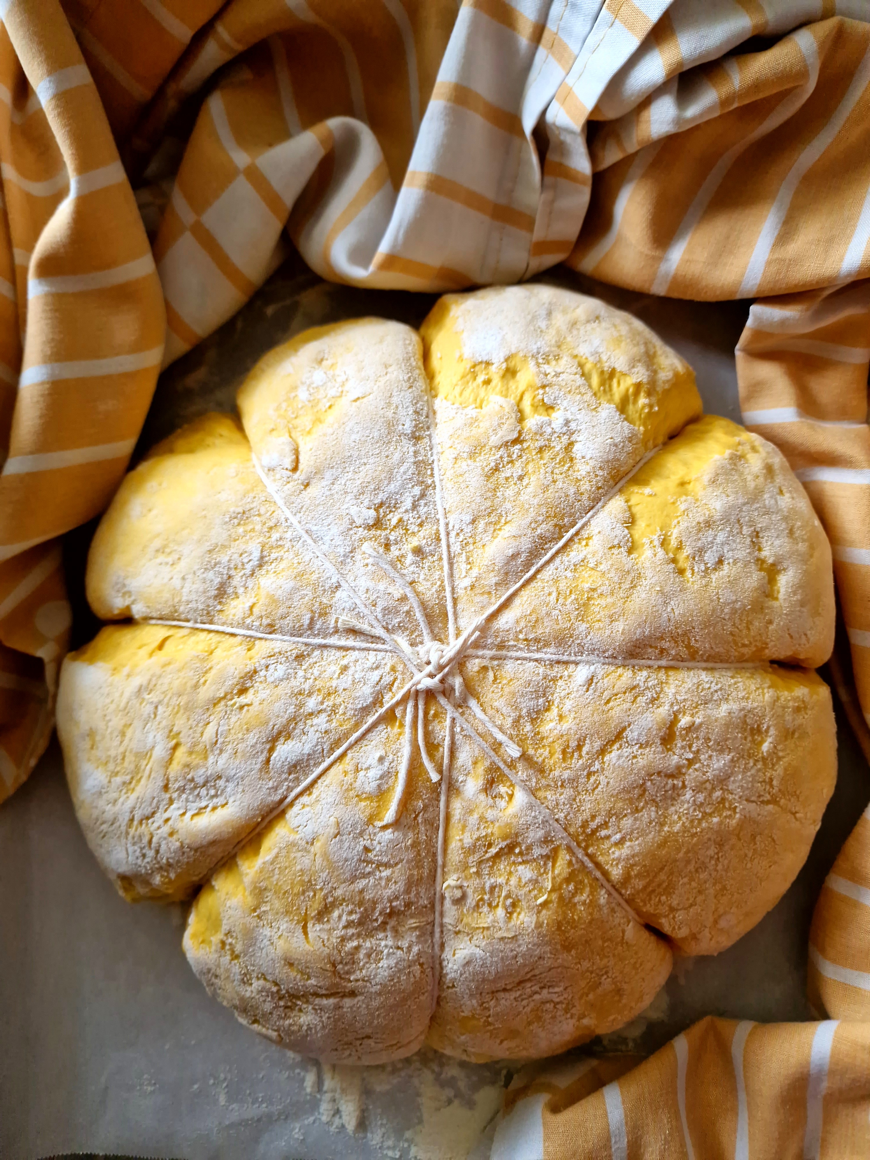 - No tabuleiro de ir ao forno, bem polvilhado com farinha, verta a massa, e forme uma bola sem amassar muito. Passe 4 fios por baixo da massa, sem a cortar nem apertar muito e dê um nó no cimo. Corte as pontas de fio. Veja as fotos.