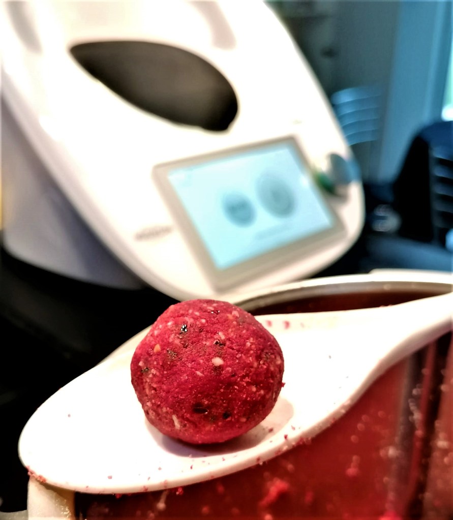 Tudo para dentro do robô e obtemos uma trufa perfeita. Esta é de beterraba, uva passa, amendoim, coco e vinho do Porto.