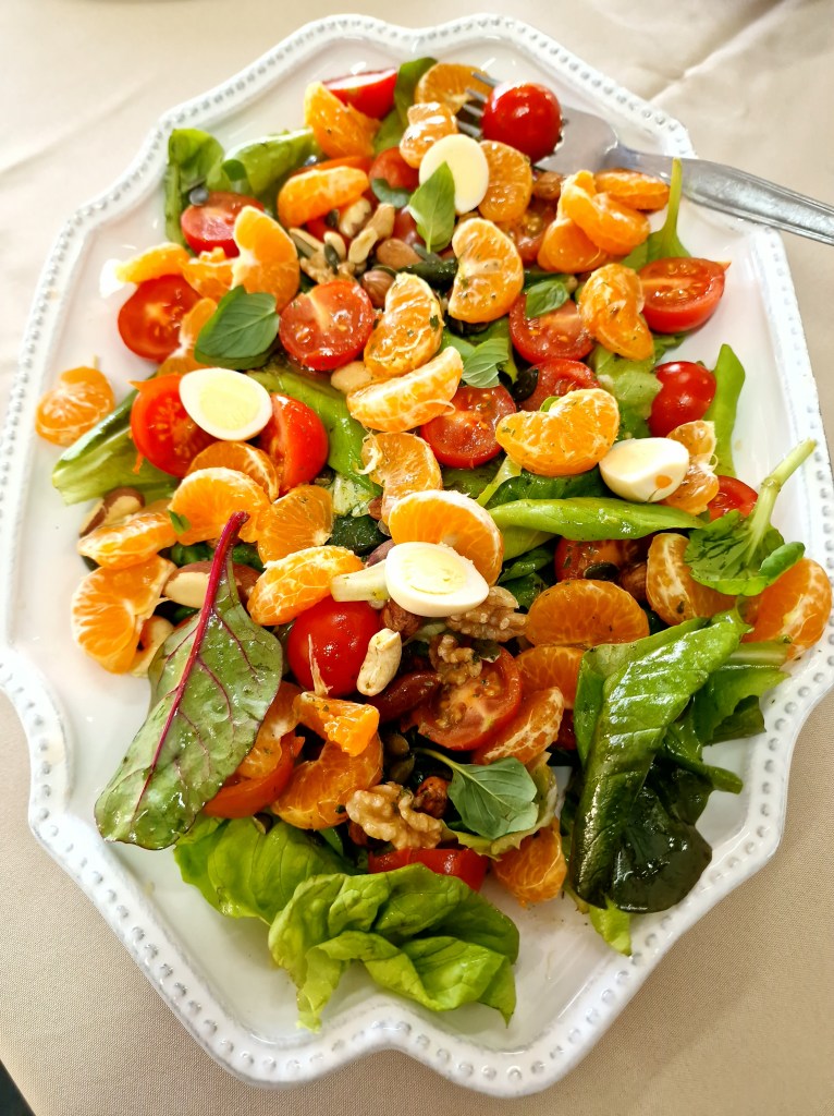 Salada baby-leaf com maçã verde, ovos de codorniz cozidos, frutos secos e vinagrete de citrinos
