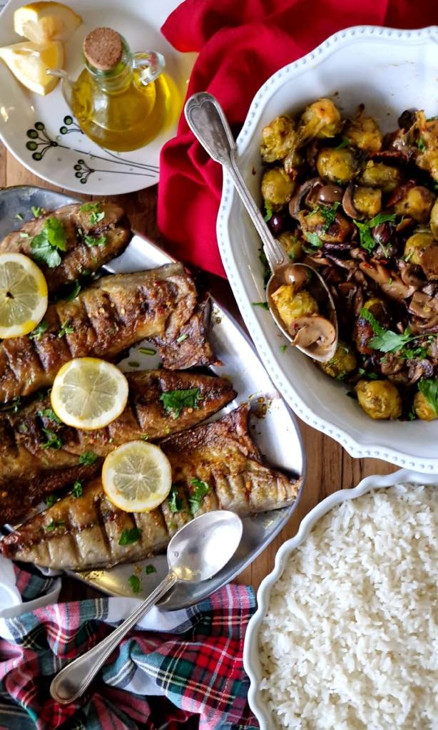 Cavala na brasa com salada quente de couve-de-bruxelas, azeitona e tomate seco e arroz branco