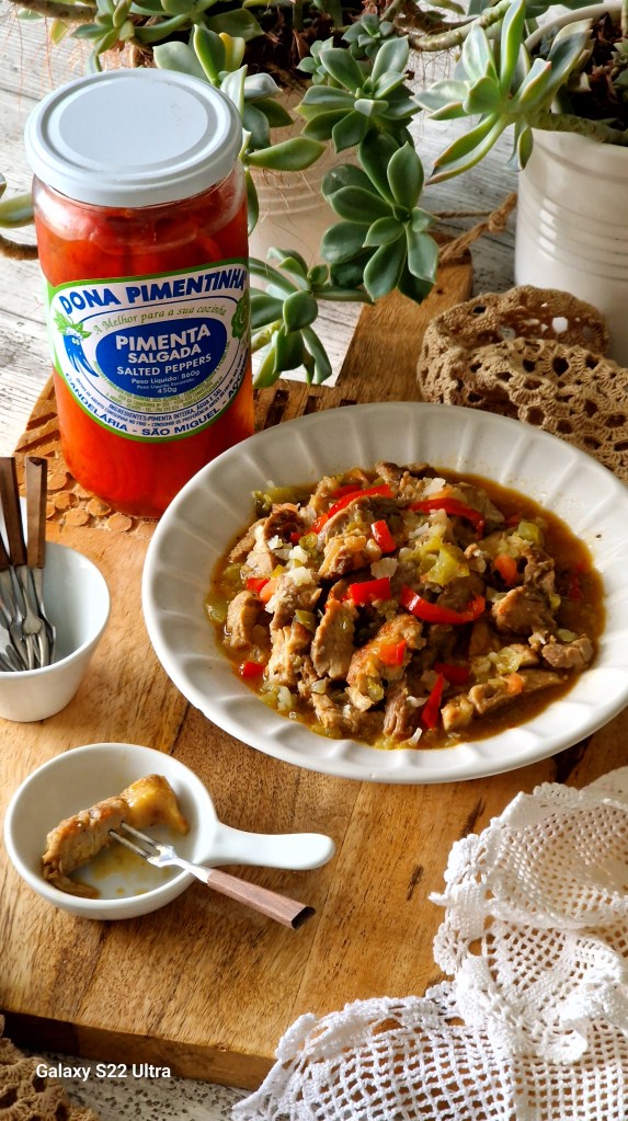 Desta vez, fiz com carne de porco – cachaço – porque acho que com carne mais magra não fica tão saboroso. Para introduzir um twist açoriano, finalizei a receita com algumas tirinhas de Pimenta Salgada (Dona Pimentinha) que, conjuntamente com os pickles, conferiu um sabor tão nosso.