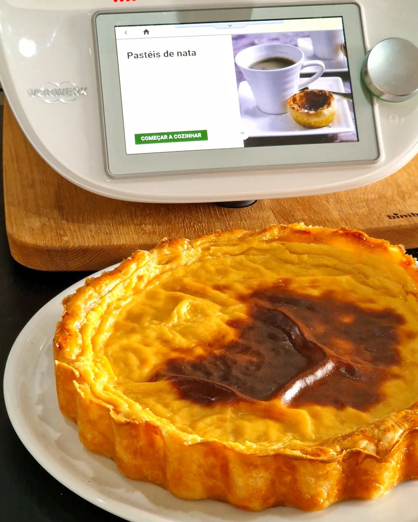 Cá em casa adoramos pastéis de nata, mas a verdade é que temos de cortar nas calorias, apesar de ainda ser Carnaval. Assim, saiu, em menos de 15 minutos de preparação na Bimby, uma Tarte de “Nata” só que sem natas. O forno fez o resto.